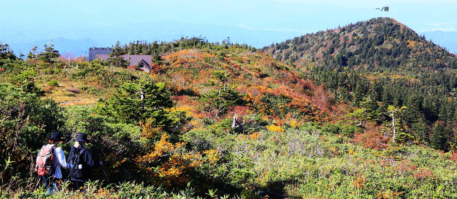一ノ腰にて ミネカエデと山頂(向岳中央火口丘) |