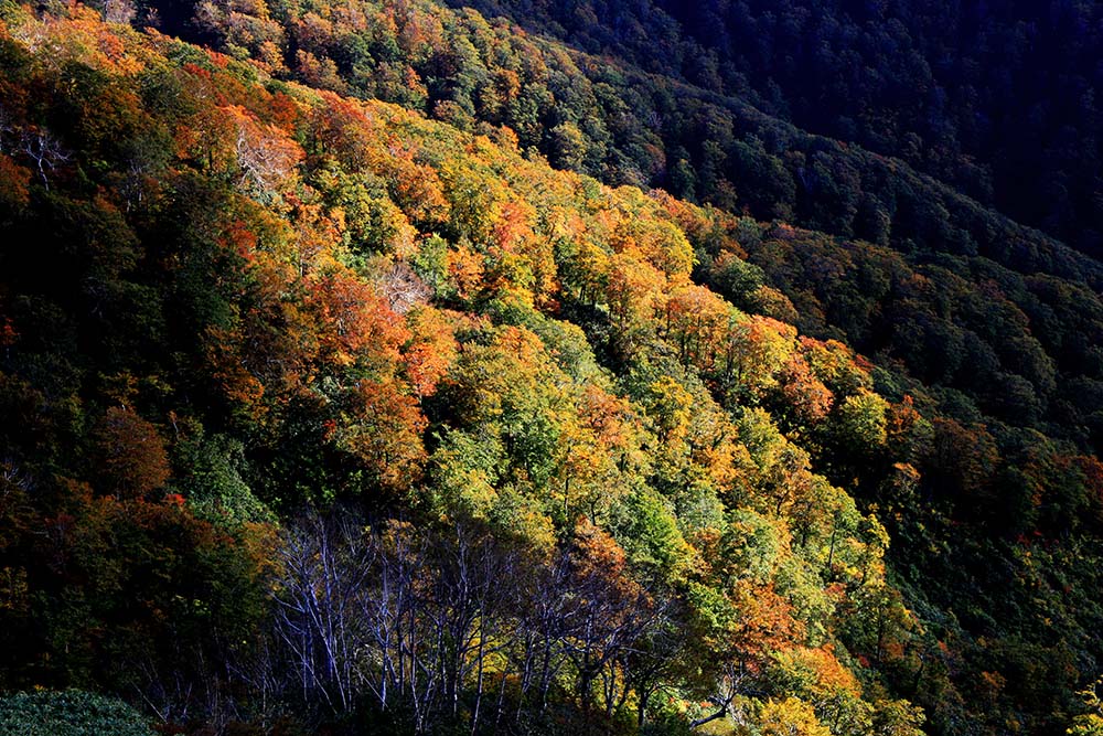 稜線部のダケカンバやミネカエデの紅葉が始まる。