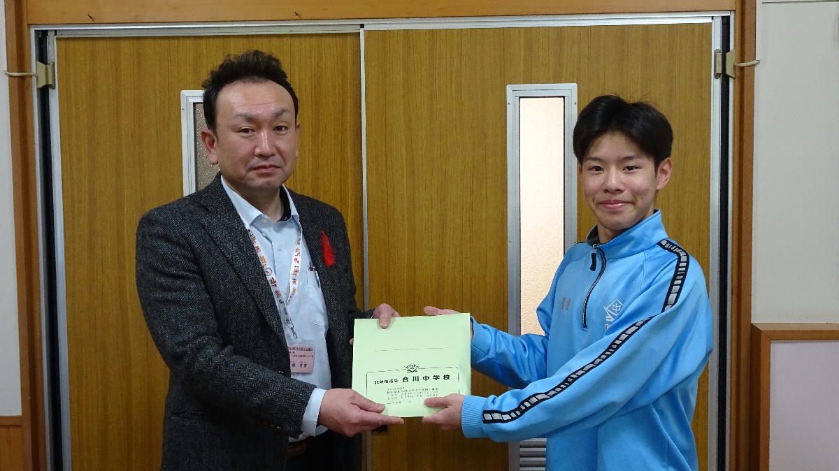 委員会活動で集めた募金を、社会福祉協議会の代表の方に贈呈しました。合中生の気持ちが、困っている方々を助けることに役立って欲しいと願っています。