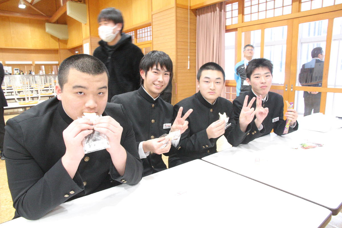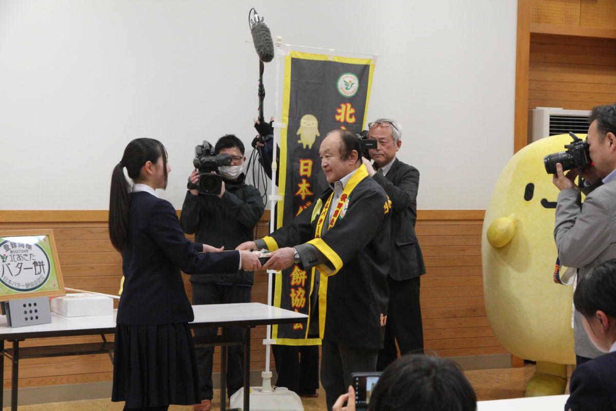 日本バター餅協会の湊屋会長さんから、「点がのび~る」合格祈願バター餅を頂きました。にこにこ合格できるよう、一人2個頂きました。当日はテレビや新聞、市の広報誌やタウン誌など、6社の記者さんや担当者さんにきてもらい、取材をして頂きました。全員、自分の進路が実現できるといいです。がんばります。