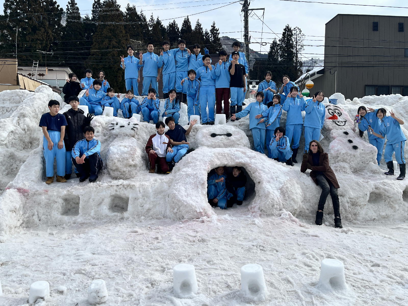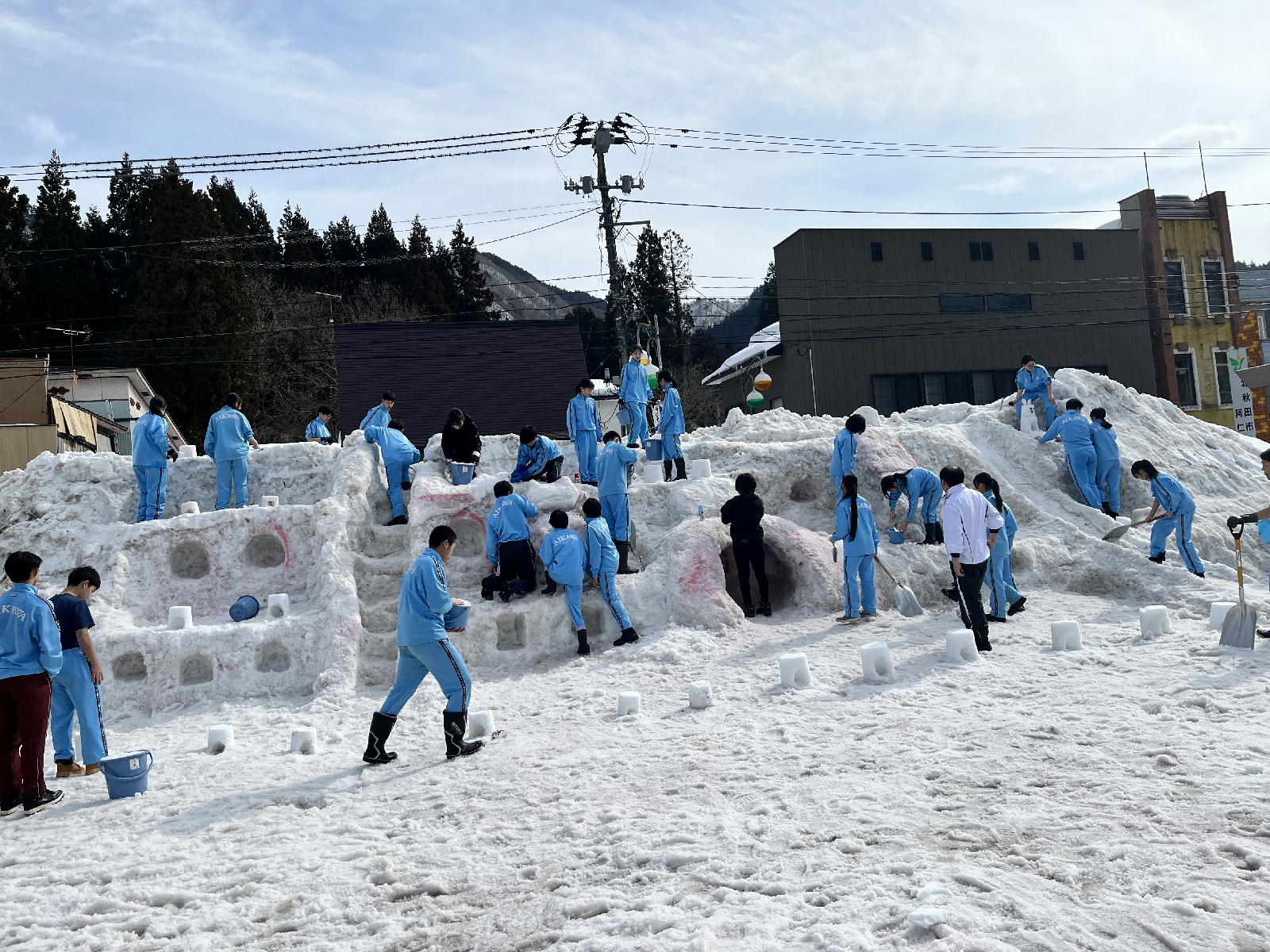 先日、北秋田市スノーキャンドルで展示されるスノーマウンテンづくりボランティアを実施しました。一部生徒は内陸線を利用し現地に集まりました。力仕事が得意な生徒、細かい作業が得意な生徒、意外な美的センスを発揮する生徒…、参加合中生34名の個性が遺憾なく発揮されたスノーマウンテンが完成しました。