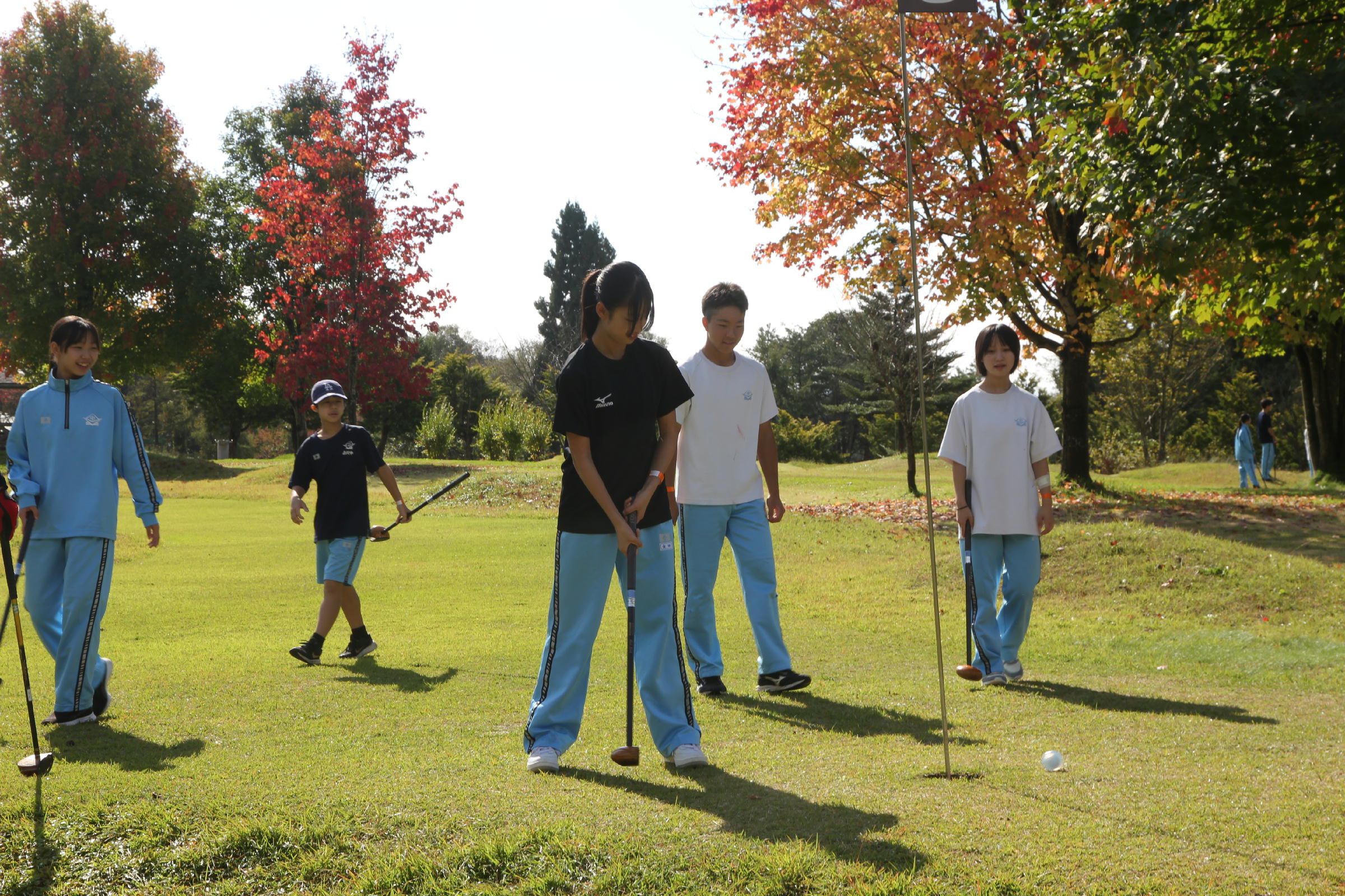 本校では、森吉山登山・桃洞の滝散策・パークゴルフ体験を3年ローテーションで行う全校野外活動を行っています。今年度はパークゴルフ体験。市パークゴルフ協会の皆さんにご協力頂き、爽やかな晴天の下、存分に楽しみました。お昼ご飯のあとは、遊具広場で大歓声をあげて遊びました。
