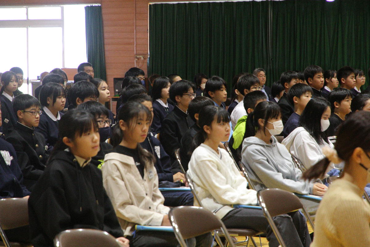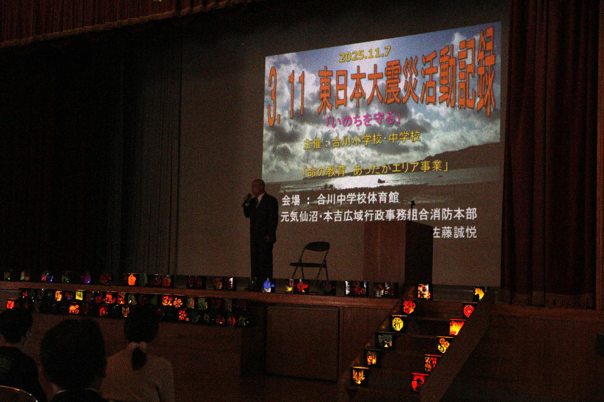 東日本大震災の語り部をしている佐藤誠悦さんをお招きして、講演会を実施しました。今回は地域に広く呼びかけ、地域の方々もいらっしゃいました。その場にいた・経験した方しか話せない体験や思い、そこから導き出される命・家族・仲間の大切さ。思いやりは形にして伝わること。様々な学びのある講演会となりました。受講した小学生も中学生も、真剣に講演を聴いていました。