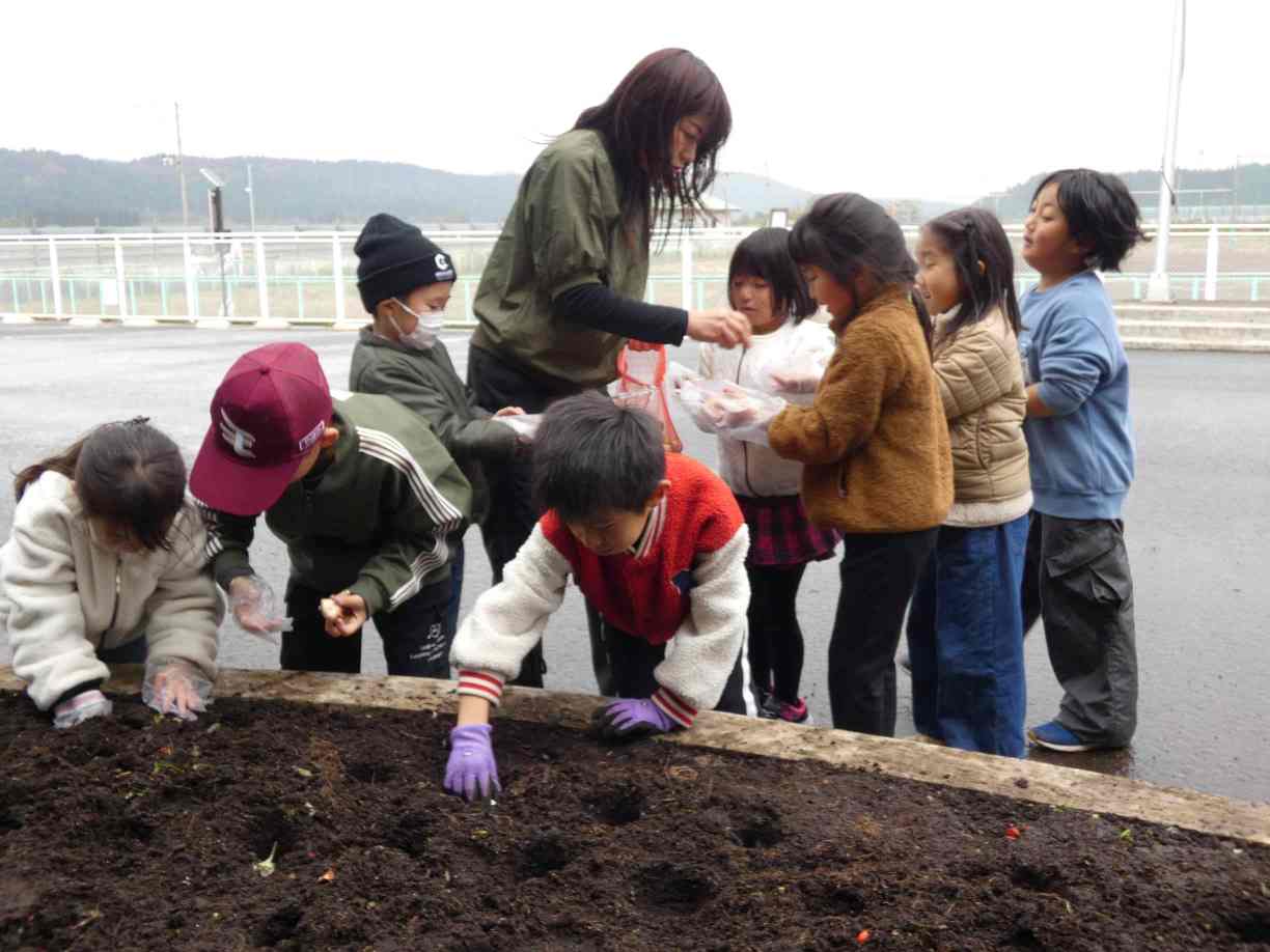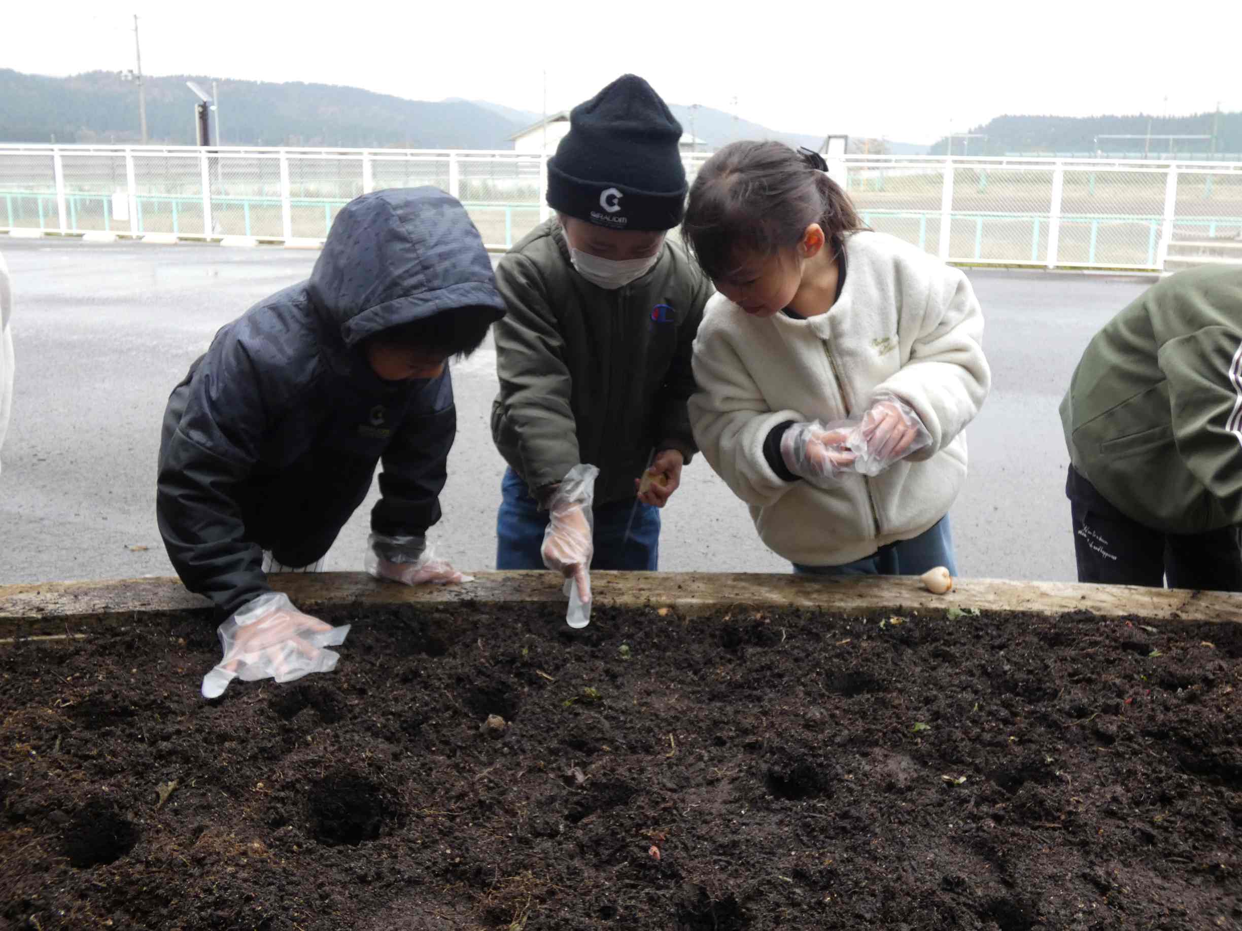 1年生が花壇にチューリップの球根を植えました。穴の中に球根を置いて、優しく土をかぶせました。最後は「さいたー、さいたーチューリップの花がー♪」と歌って、球根にエールを送ったようです。来年の春、きれいな花を咲かせてくれるのを楽しみに待ってるね。