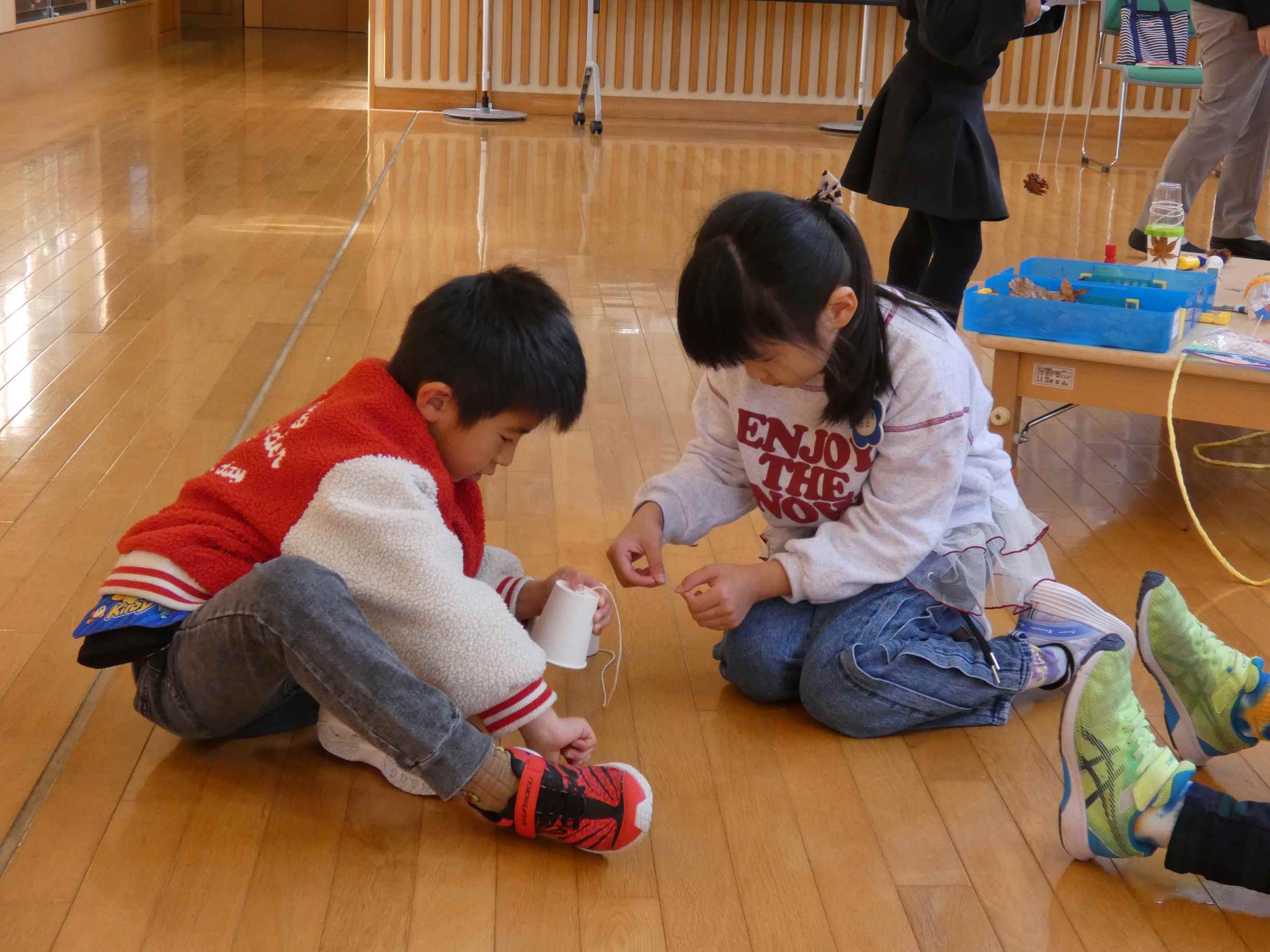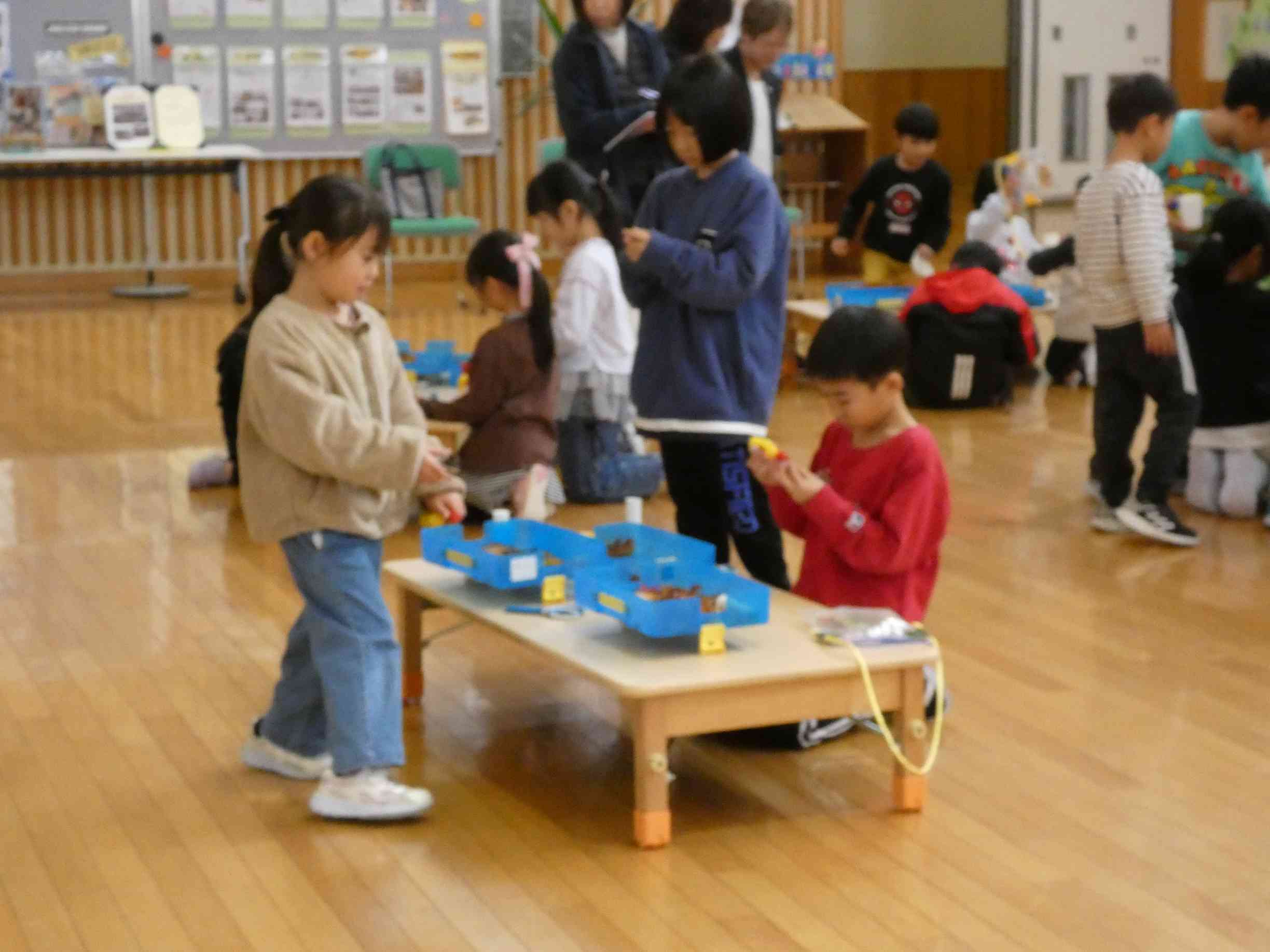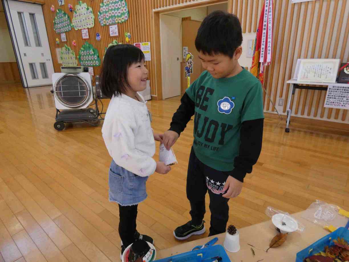 先日、年長さんと1年生が一緒に落ち葉や木の実を拾いました。6日にそれを使って,一緒におもちゃ作りをしました。相談し合ったり、できたことを一緒に喜んで楽しく遊んだり、和やかで楽しい時間はあっという間に過ぎた感じでした。「またねー。」と笑顔で見送る1年生に、バイバイと可愛らしく手をふる年長さん。交流ができて、とても有意義でした。