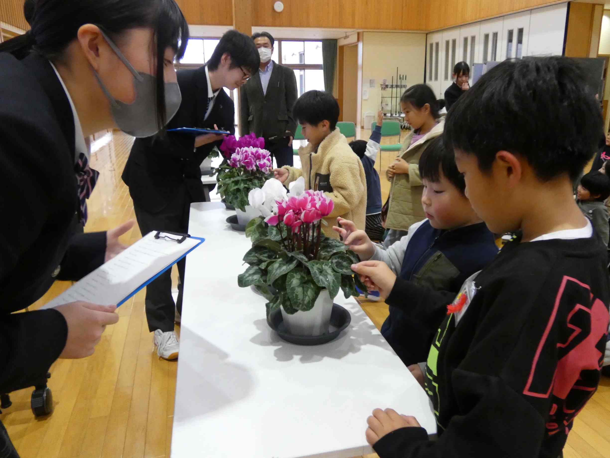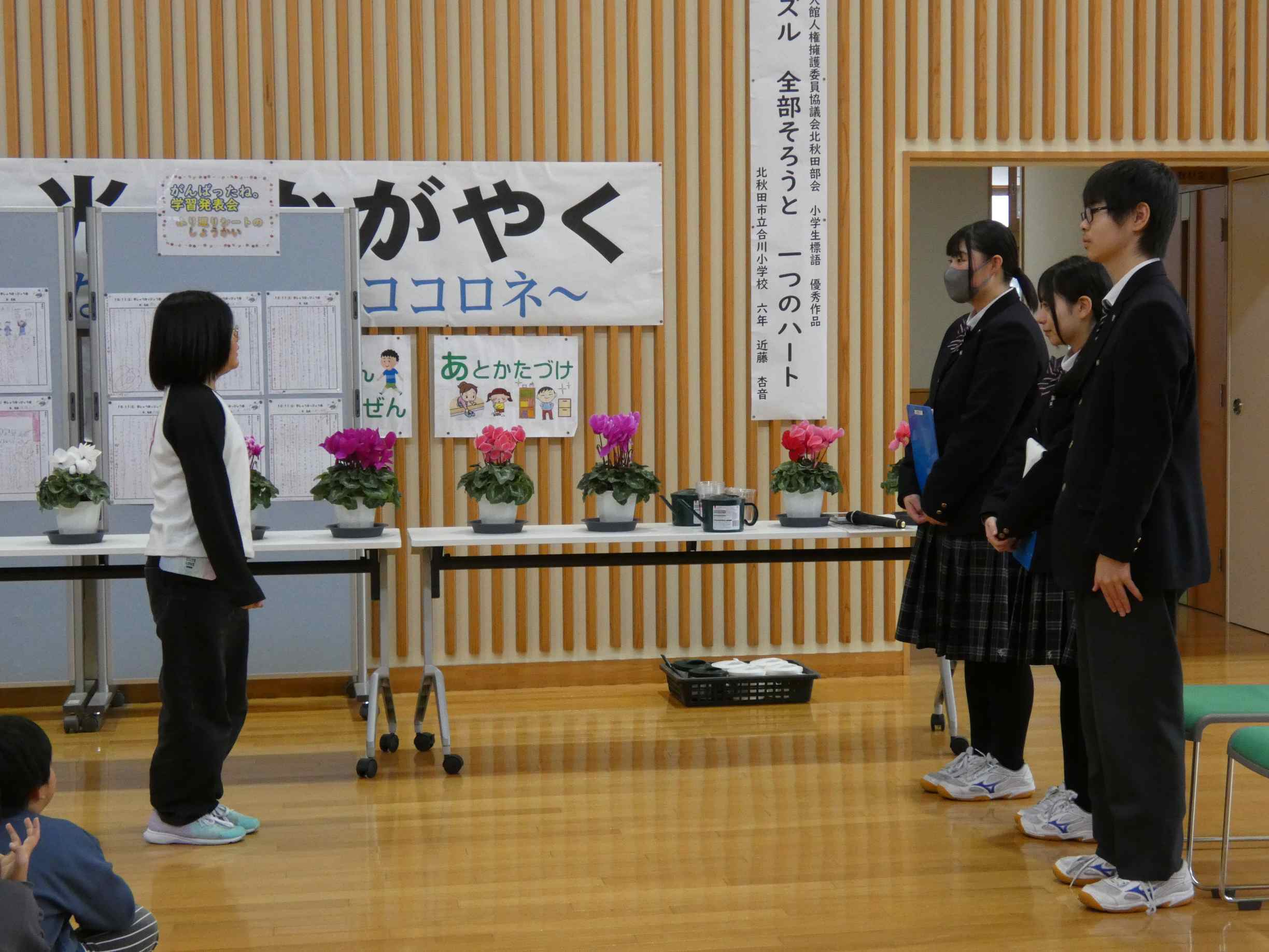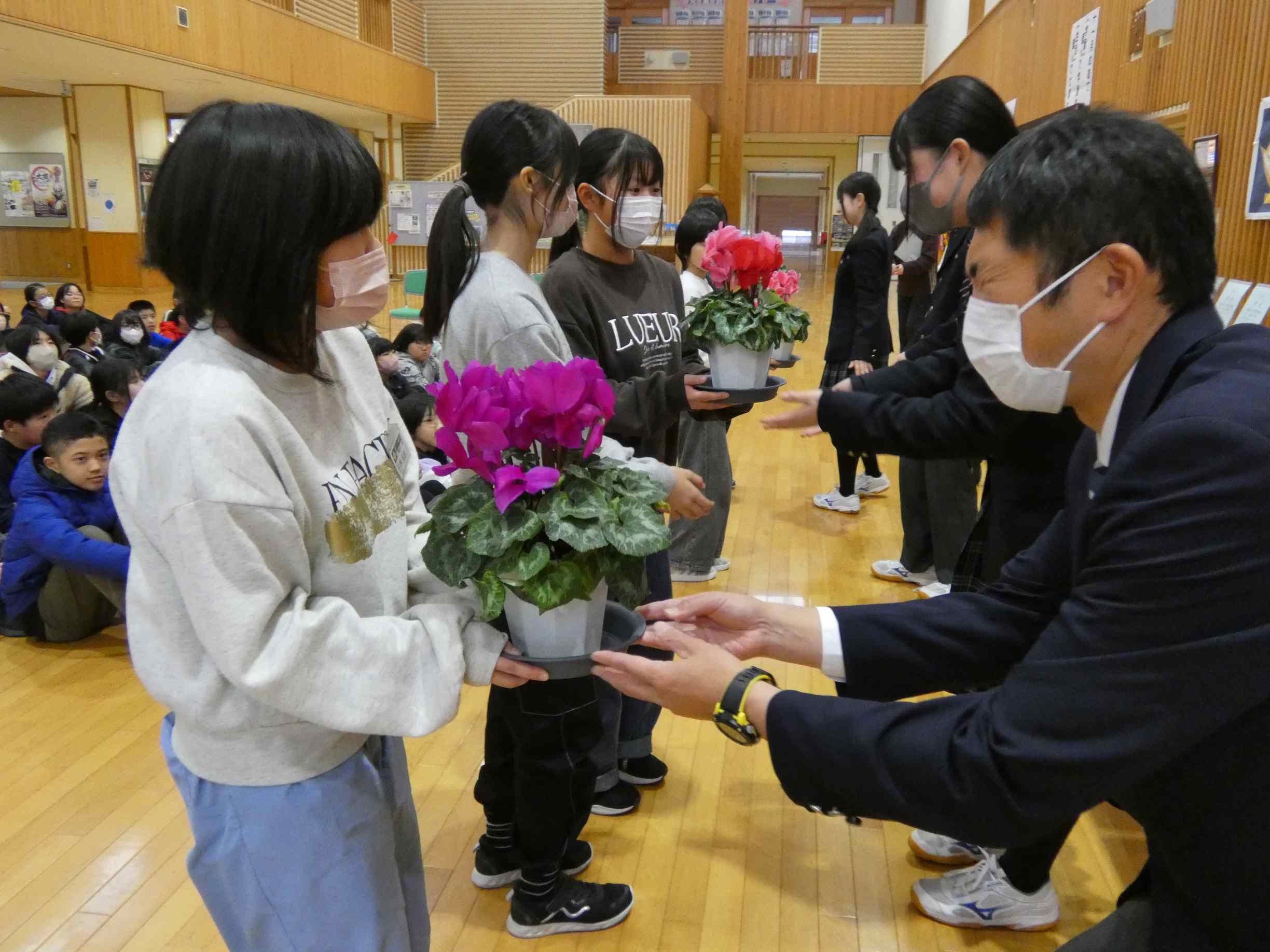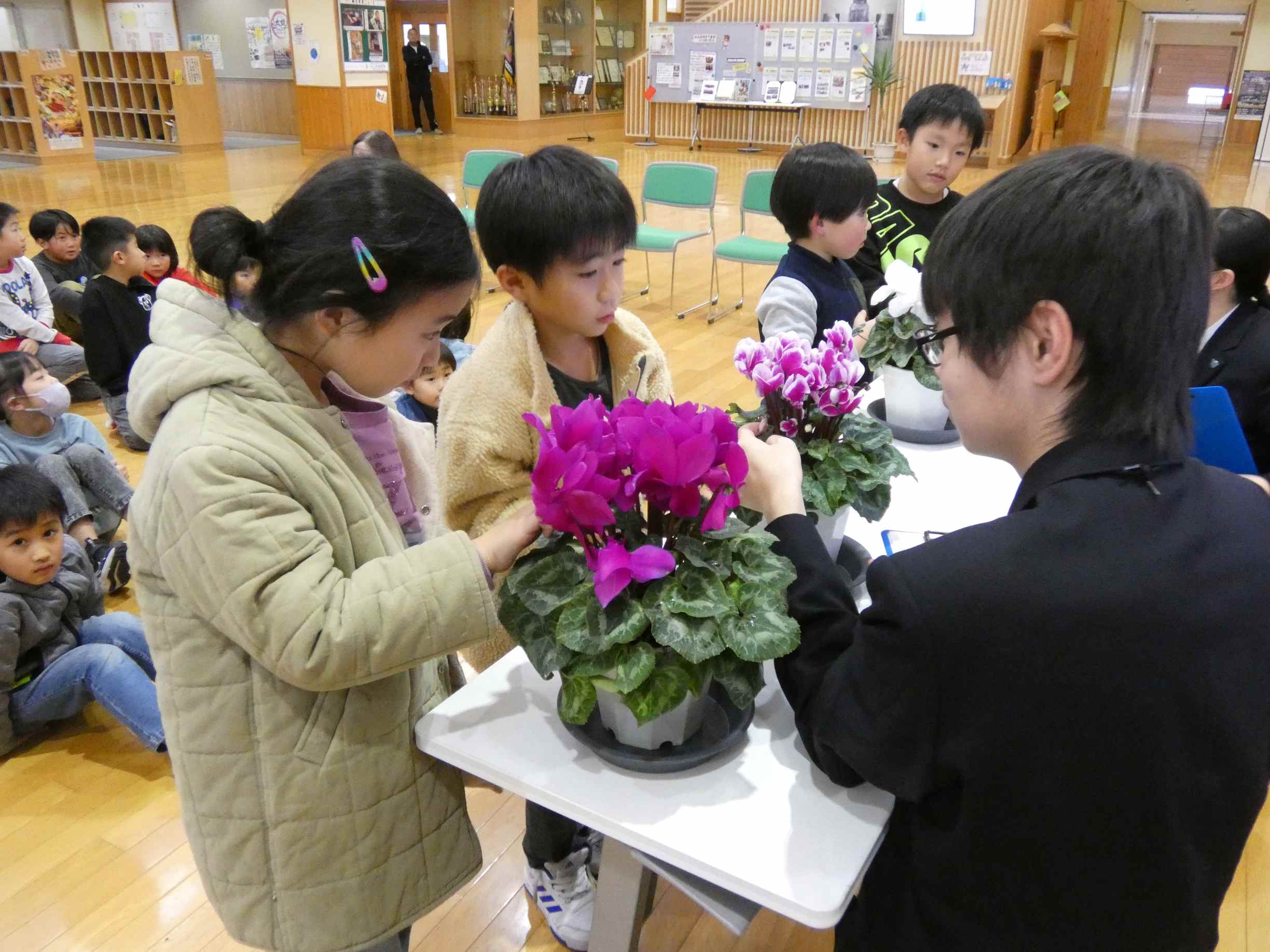 いのちの教育合ったかエリア事業には北鷹高校も指定を受けています。そのご縁で、夏には花のプランターをいただき、19日には各学級にきれいなシクラメンの鉢をプレゼントしていただきました。3人の高校生の中には合川小学校の先輩もいました。3人が花の名前や育て方をクイズ形式でプレゼンしてくれたので、とてもわかりやすく、子どもたちも盛り上がっていました。3年生と6年生が代表して、お礼のことばを伝えました。北鷹高校のみなさん、ありがとうございました。大事に育てますね。