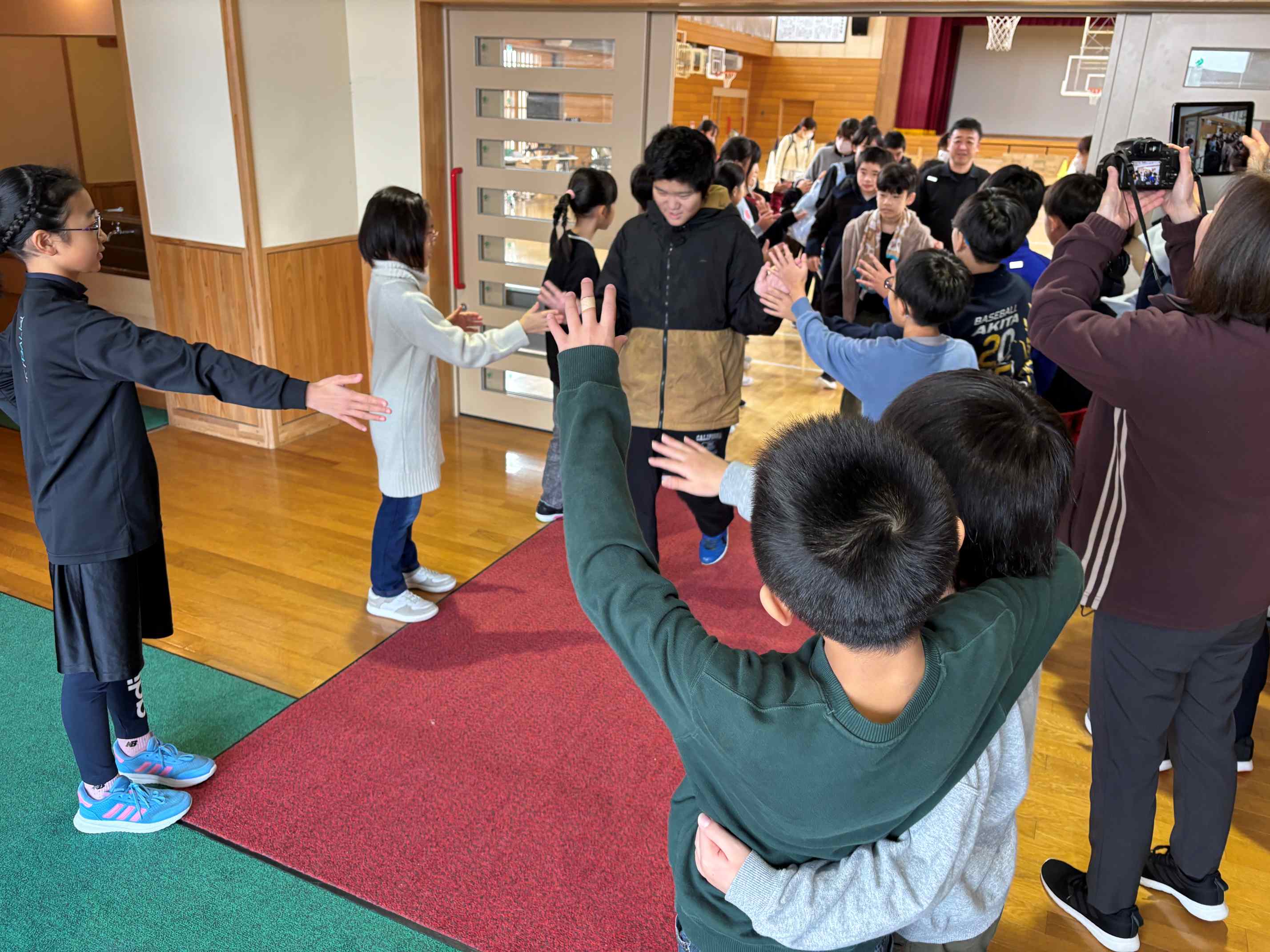 14日(金)「福田の獅子舞保存会」の方々が来校してくださり、3年生に体験を通して伝統芸能について教えてくださいました。迫力がありながらも愛らしい獅子に釘付けの3年生。獅子を動かす仕組みを試したり獅子の中に入って動いてみたり。学びを進めてくださった会長の鈴木浩二さんが「獅子の中に入ると前の人が目立つような気がするけどそうではなくて、中や後ろの人が役割をしっかり果たしてくれるからこそ,いい獅子になる。それぞれ大事なんだよ」と教えてくださいました。伝統芸能だけでなく、全ての場面に通じる大事な事だなあと思いました。子どもたちのワクワク輝く表情が印象的でした。2025/11/12
