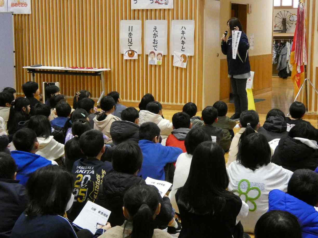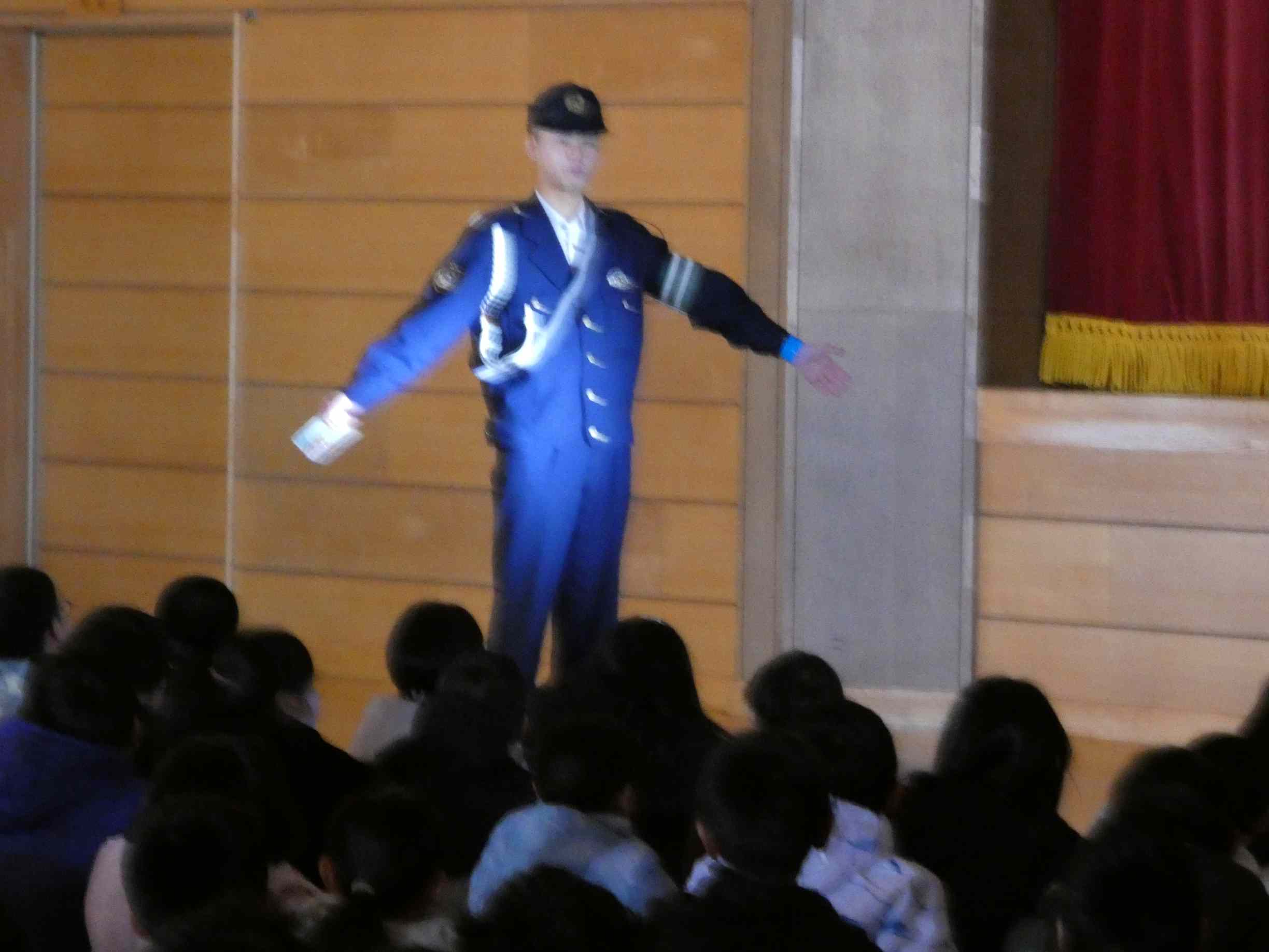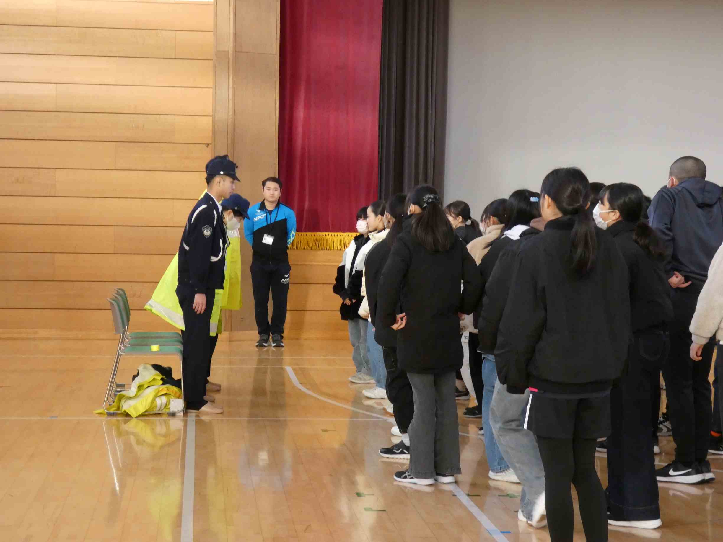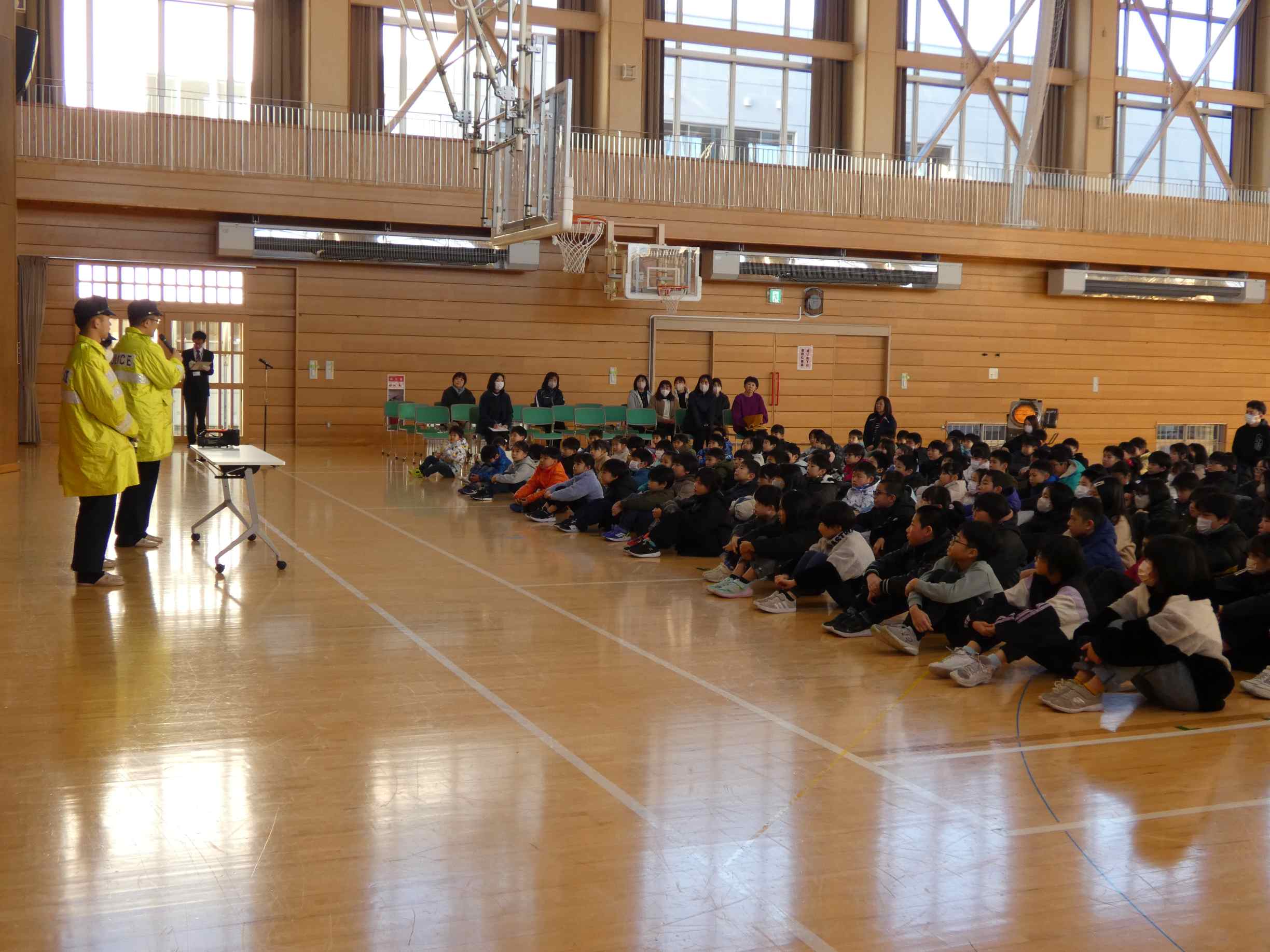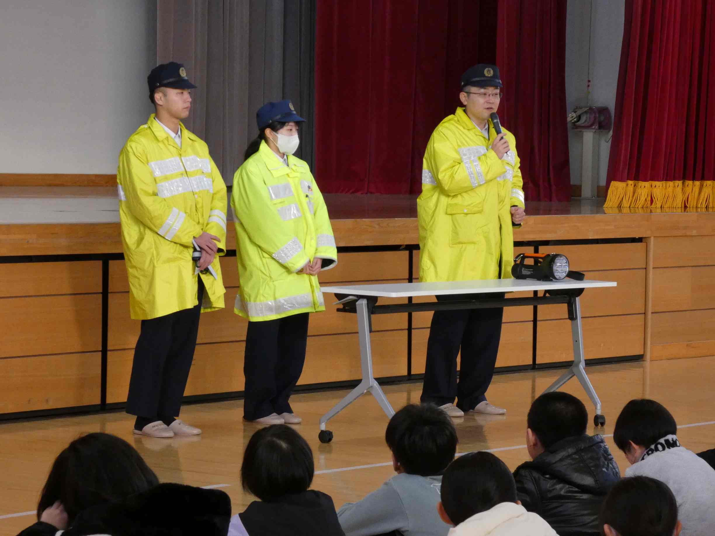 北秋田警察署から3名の警察官の方々が来校し、冬の交通安全について教えてくださいました。冬になると黒っぽい服を着る人が多く、車からの発見が遅れることがあるため、反射材をつけるとよいことを話してくださいました。実際に実験してみせてもらい、その効果に驚いていました。また雪道の安全な歩き方についてもお話しいただきました。今回の学びを活かして、安全に過ごしてほしいです。