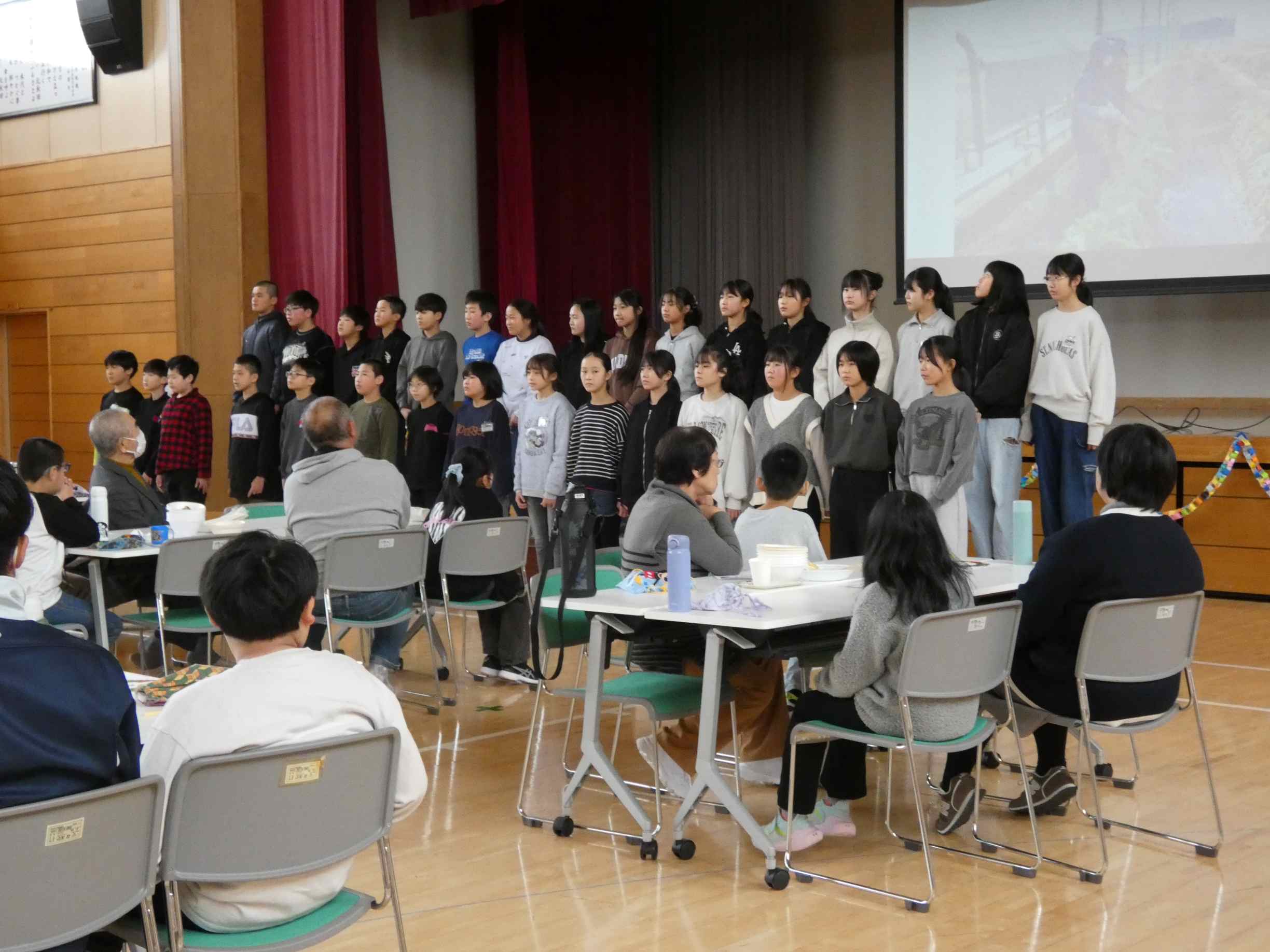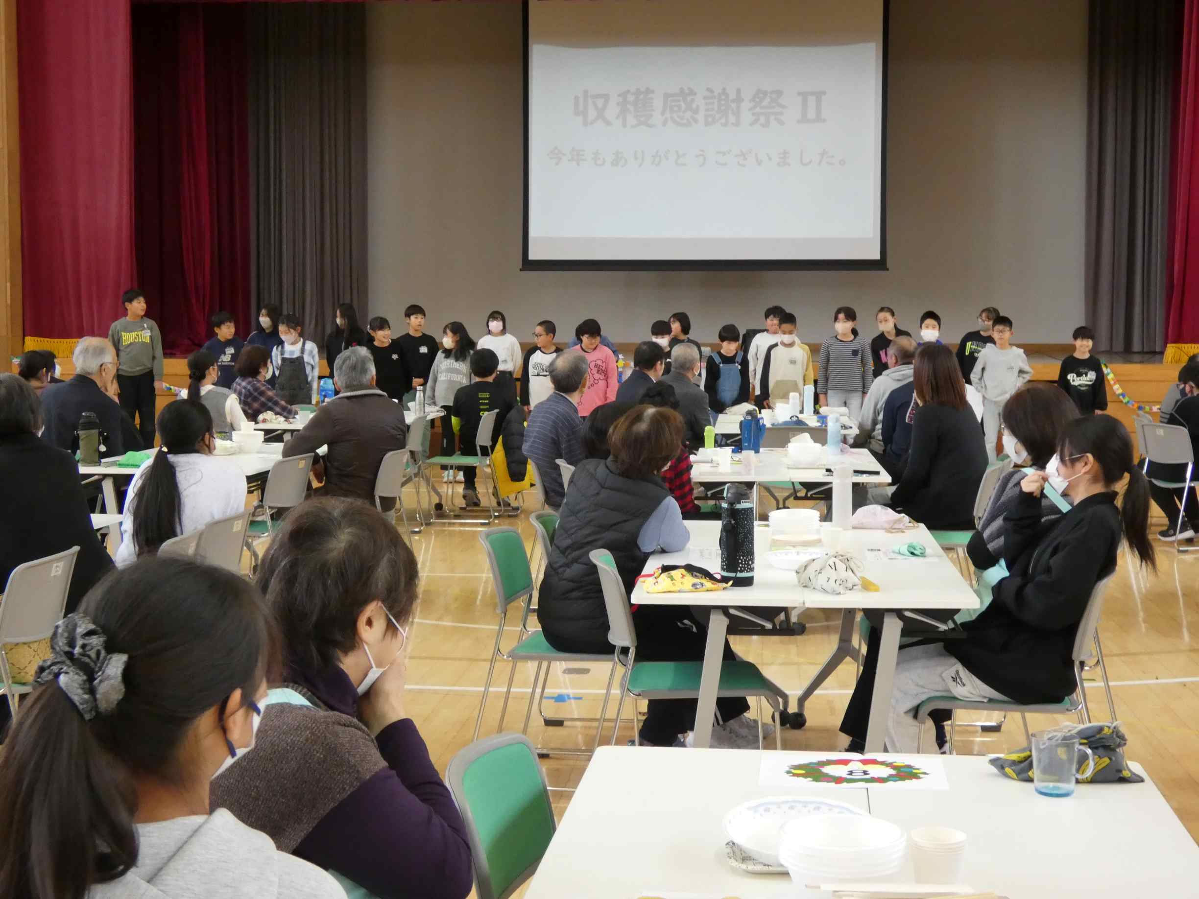 19日(金)、学校の活動でお世話になった方々を招待し収穫感謝祭パートⅡを開催しました。5・6年生が総合的な学習で学んだ郷土の食文化のことを活かし、きりたんぽと大根の酢漬け、大根サラダがごちそうのメニューです。和やかに会食したり、5・6年生の発表を見たりして時間はあっという間に過ぎました。みんなでお見送りして最後まで感謝の気持ちを伝えました。