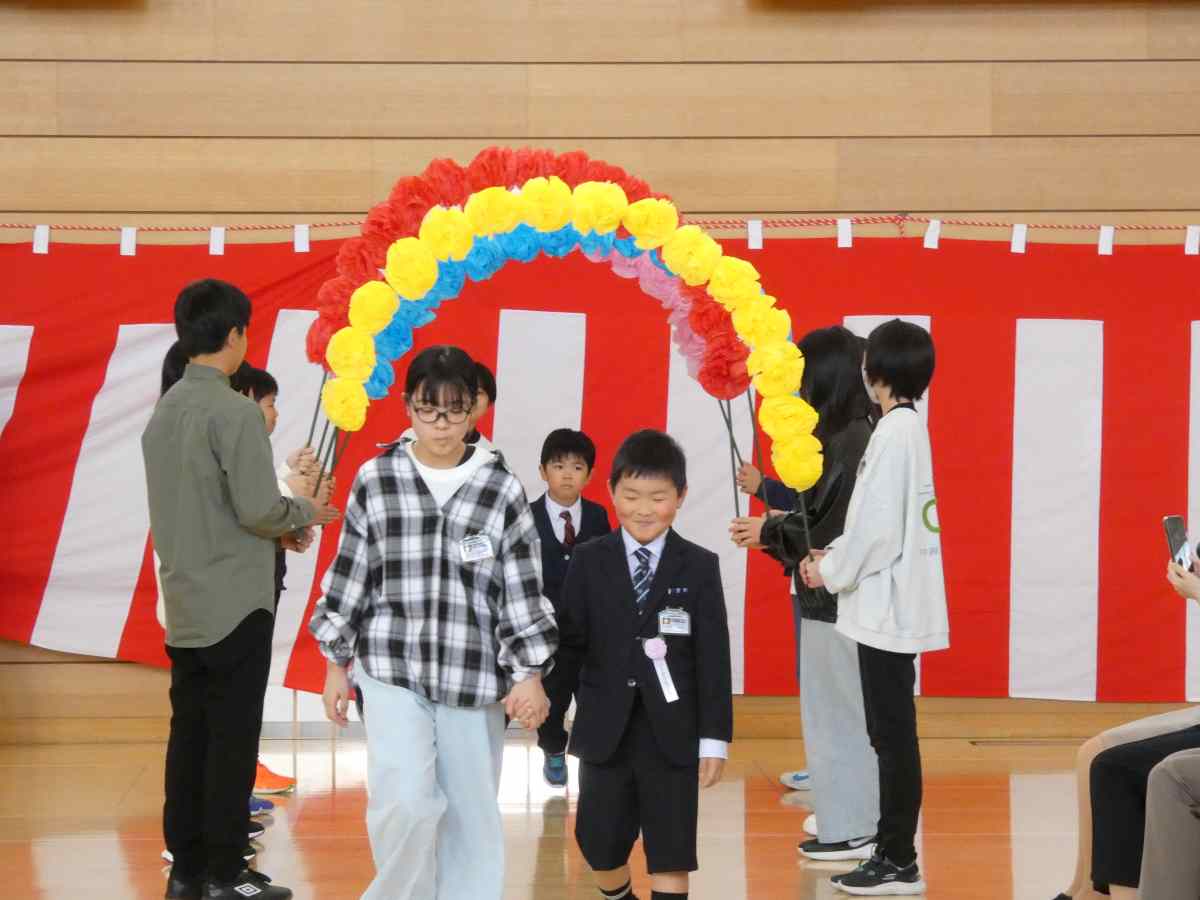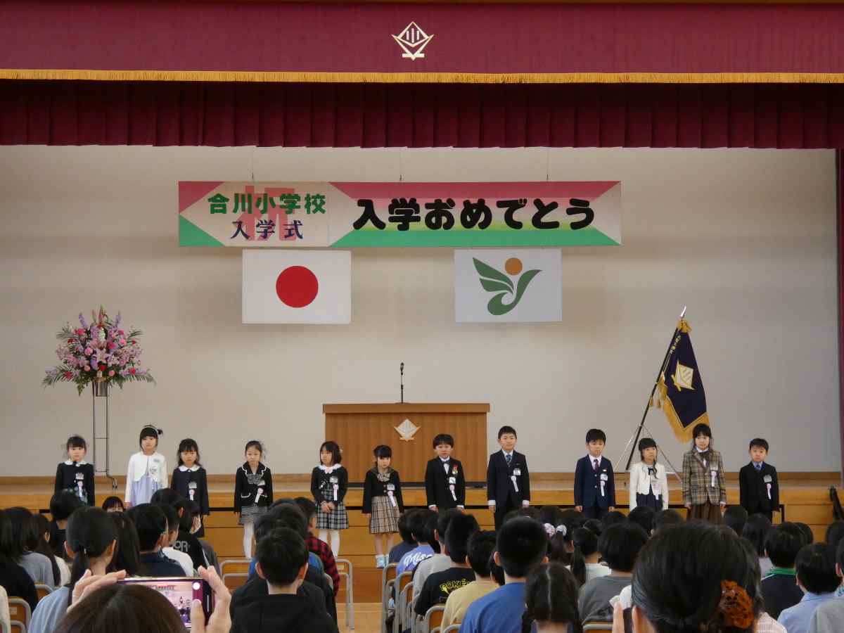 合川小学校に新1年生12名が入学しました。大きなランドセルを背負い、笑顔で学校にやってきました。これまで何度か保育園と小学校の交流を行ってきたこともあり、子どもたちに過度の緊張はなく、わくわくした表情でした。6年生と手をつないでアーチの中を入場。在校生も笑顔で迎え、元気な校歌をプレゼントしました。6年生代表の歓迎のことばをしっかりと聞く1年生でした。