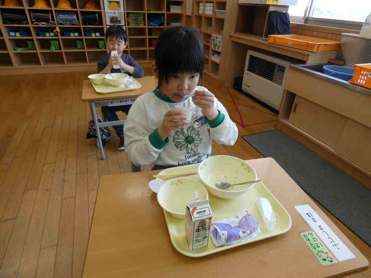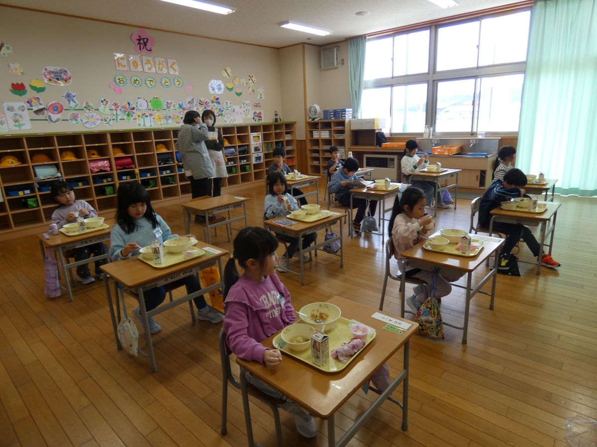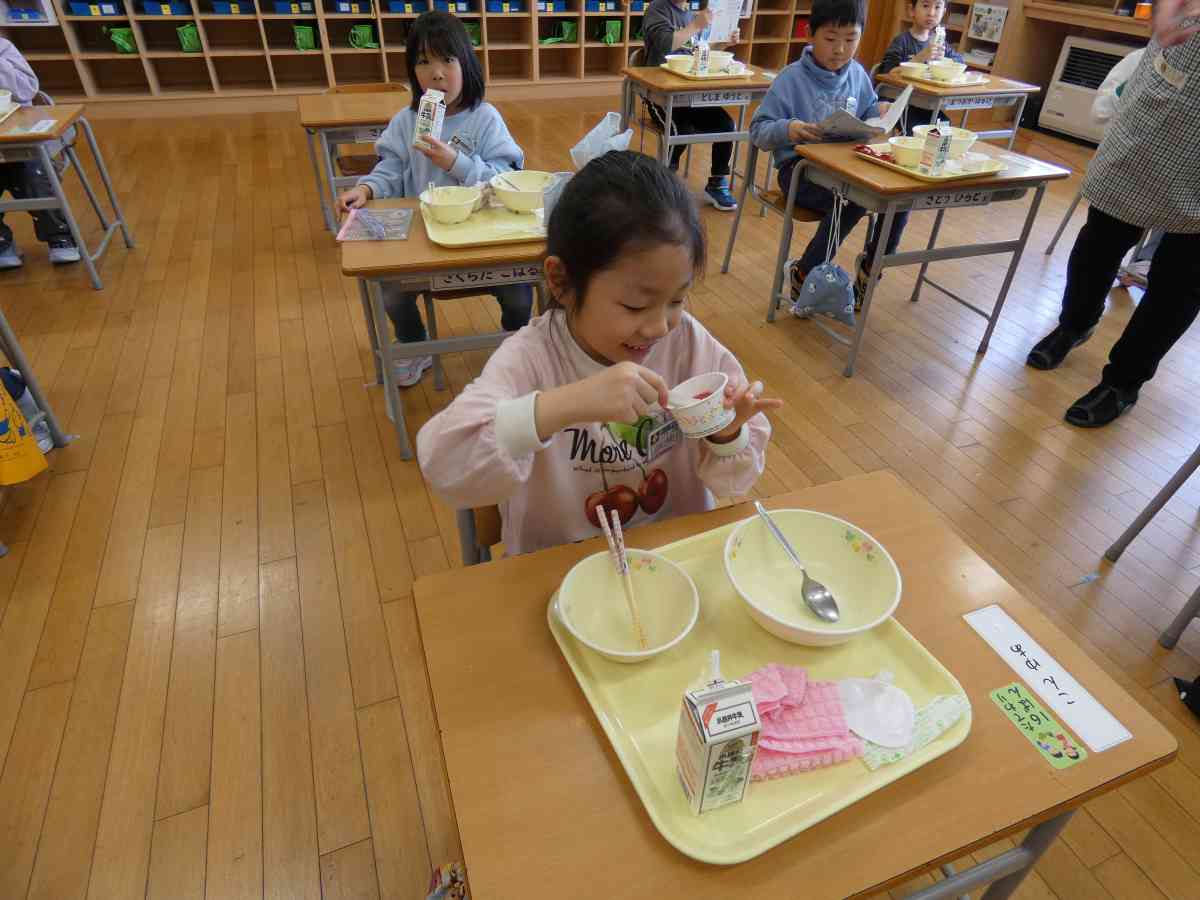 4月14日から1年生の給食がスタートしました。初めてのメニューはそぼろ丼、油揚げの味噌汁、牛乳、お祝いいちごゼリーでした。そぼろ丼は1年生が聞き慣れているメニューだろうということで栄養士さんが考えてくださいました。みんなおいしそうにニコニコと食べていました。