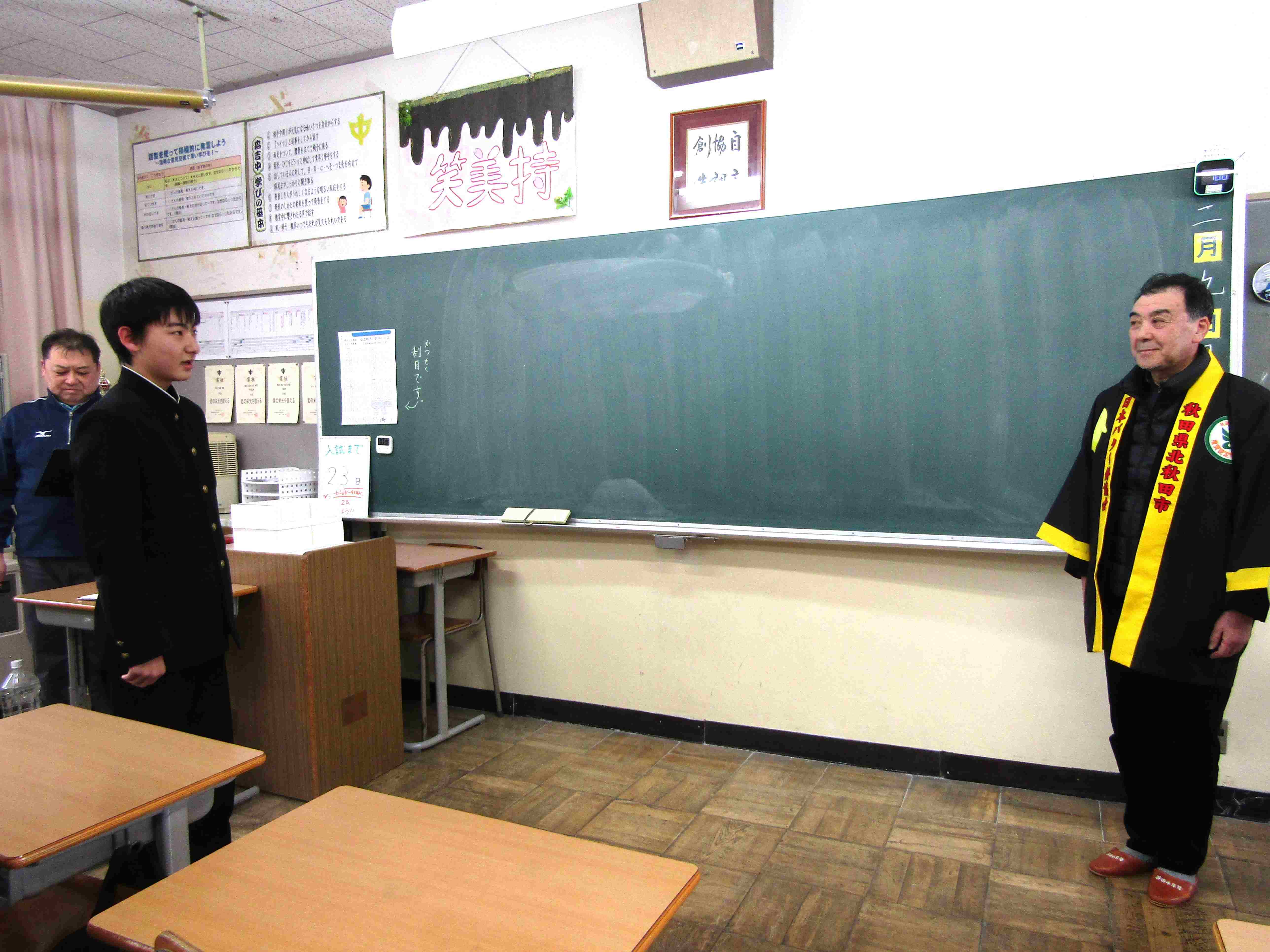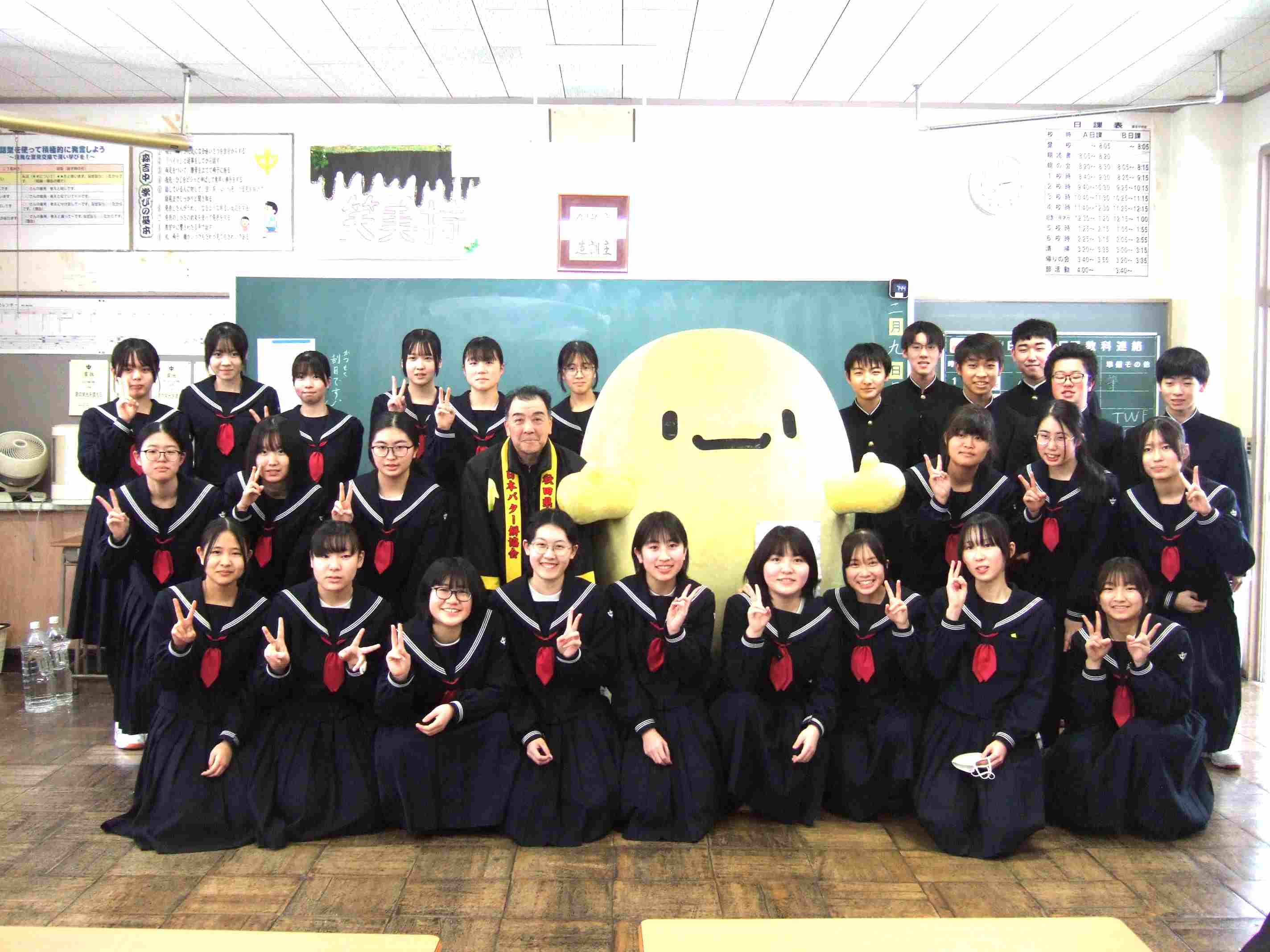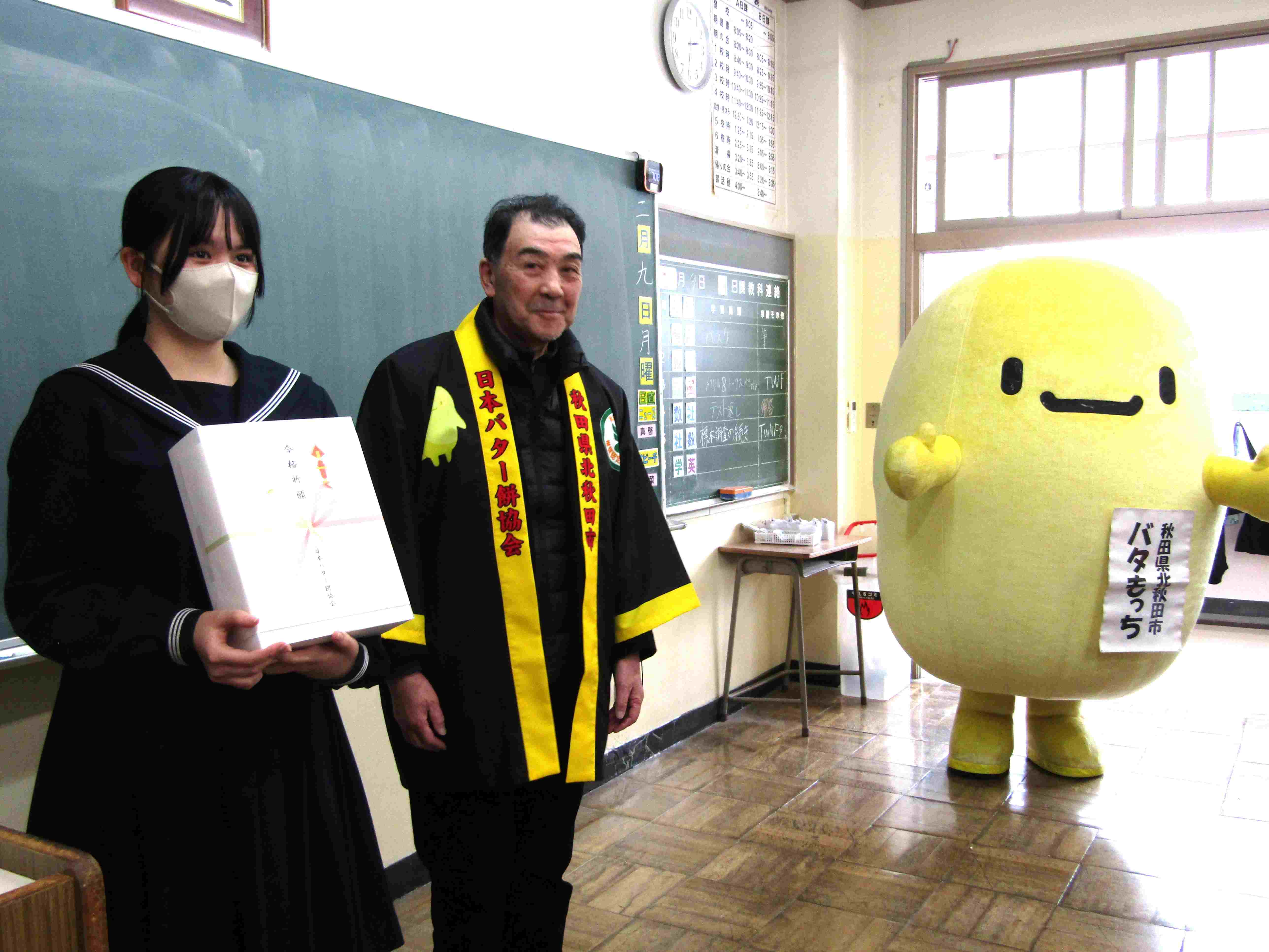 日本バター餅協会副会長 大川様がご来校くださり、『点が伸びる合格祈願バター餅』贈呈式が行われました。全員が良い結果を出して「ニコニコ」できるように、一人2個ずついただきました。贈呈式の後、みんなでいただきましたが、厚切りで力がわいてくるようなもっちりとした食感でした。また、龍淵寺様より『合格祈願お守り』をいただきました。地域のたくさんの方々の応援を力にして、夢を叶えるために最後までベストを尽くします。