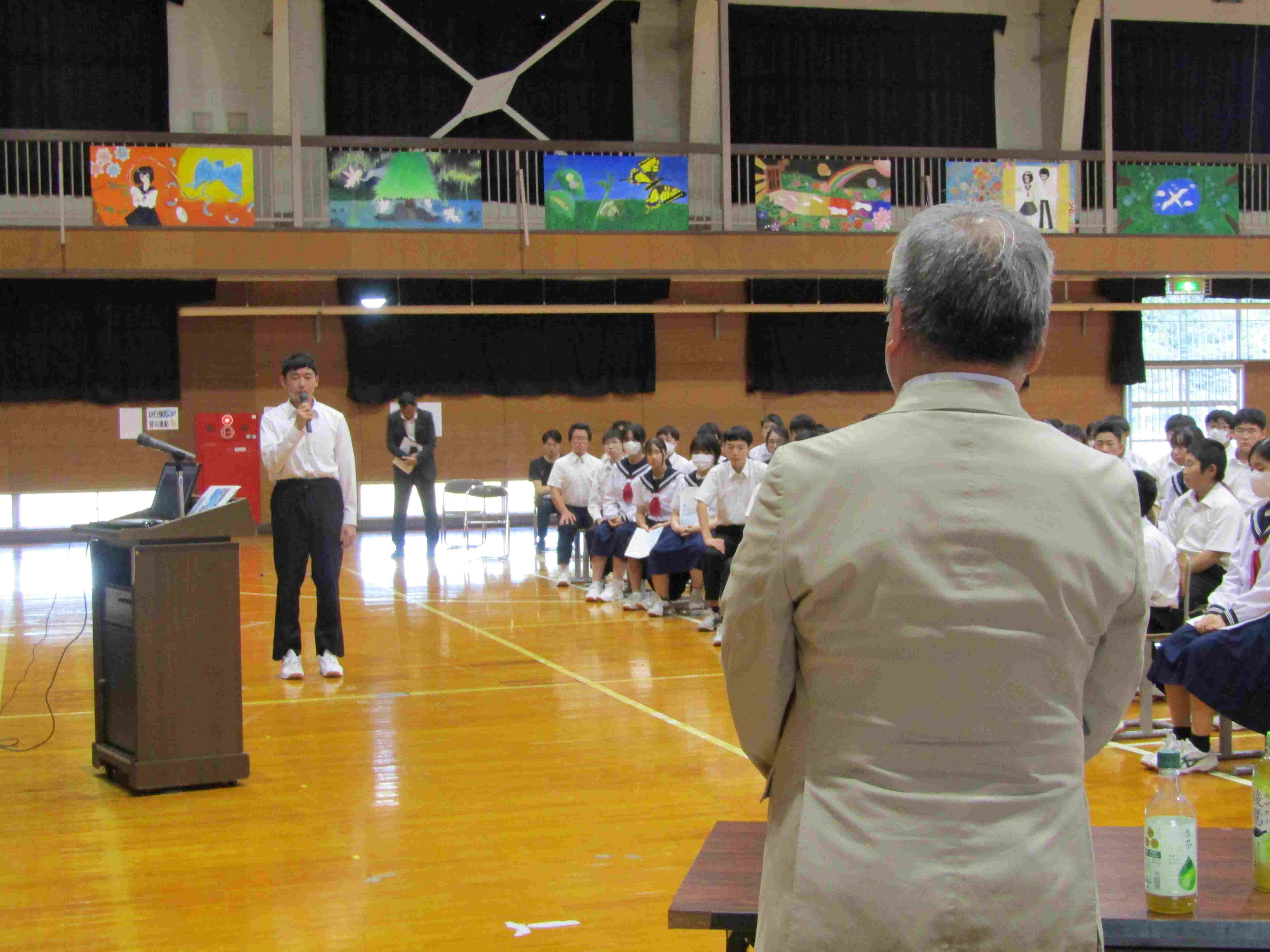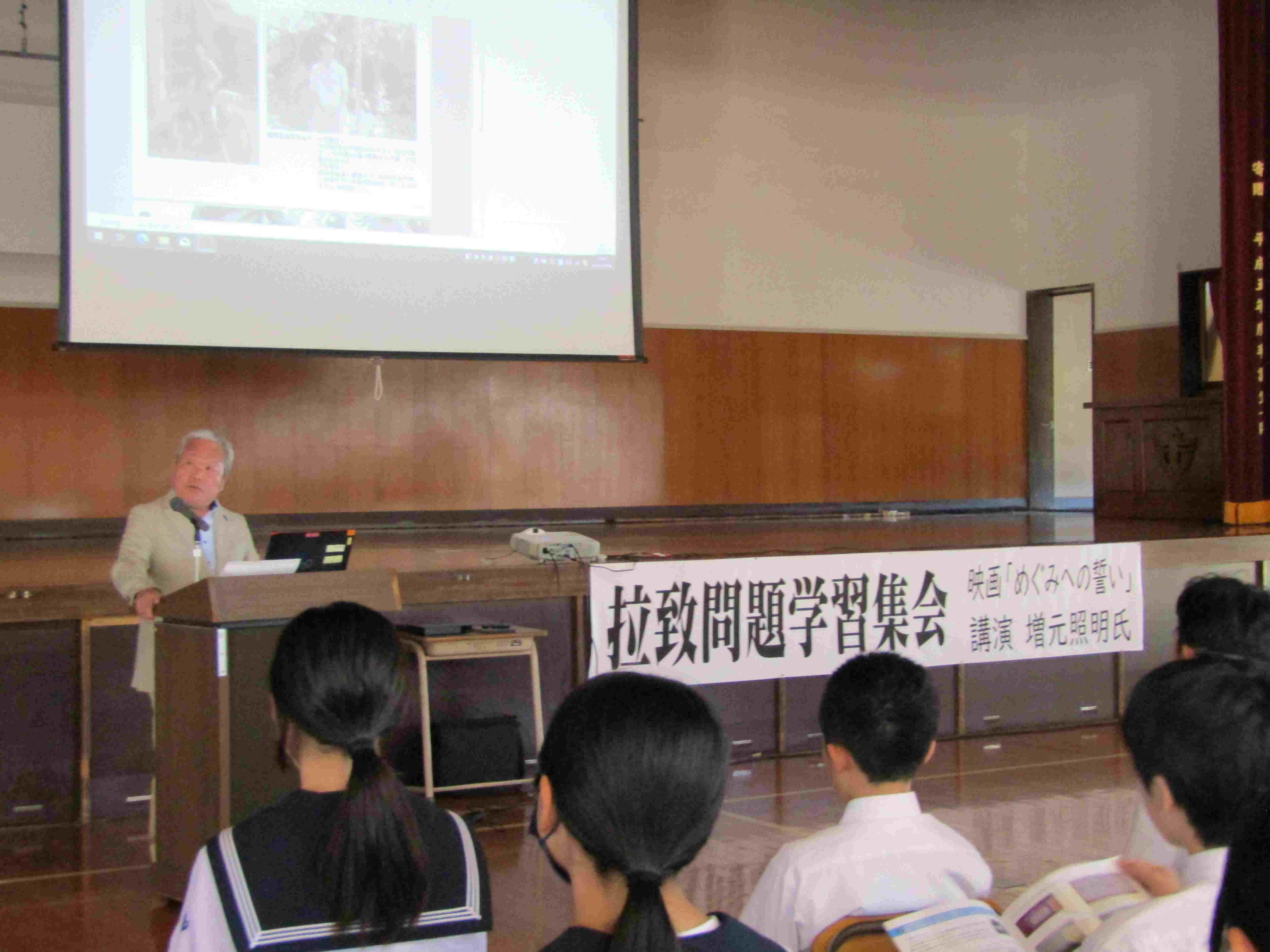 秋田県企画振興部国際課の企画による拉致問題学習集会が開かれました。映画「めぐみへの誓い」上映後、拉致被害者のご家族である増元さんのお話をお聞きし、平穏な生活が突然奪われることの恐ろしさや苦しさを痛感しました。会の最後に、代表生徒から「一人一人がこの問題に関心を持ち続けることが解決につながると思います。」と感想が述べられました。