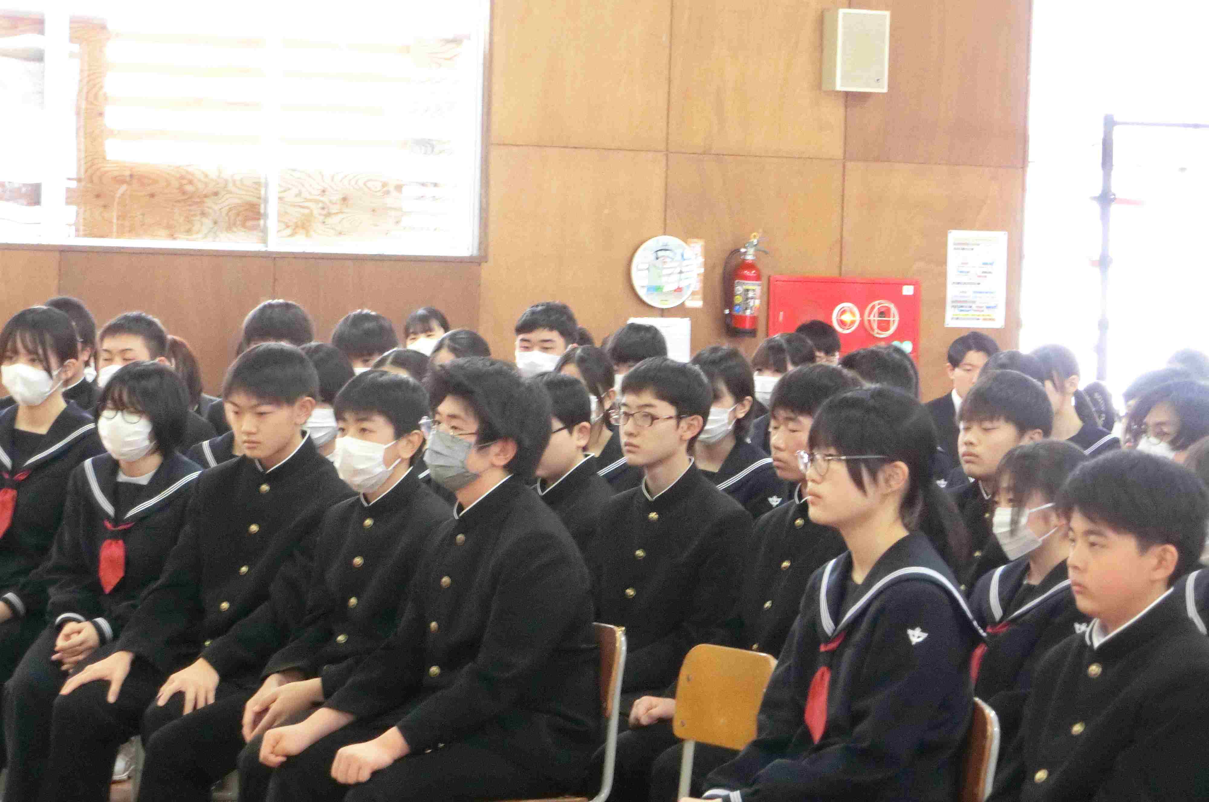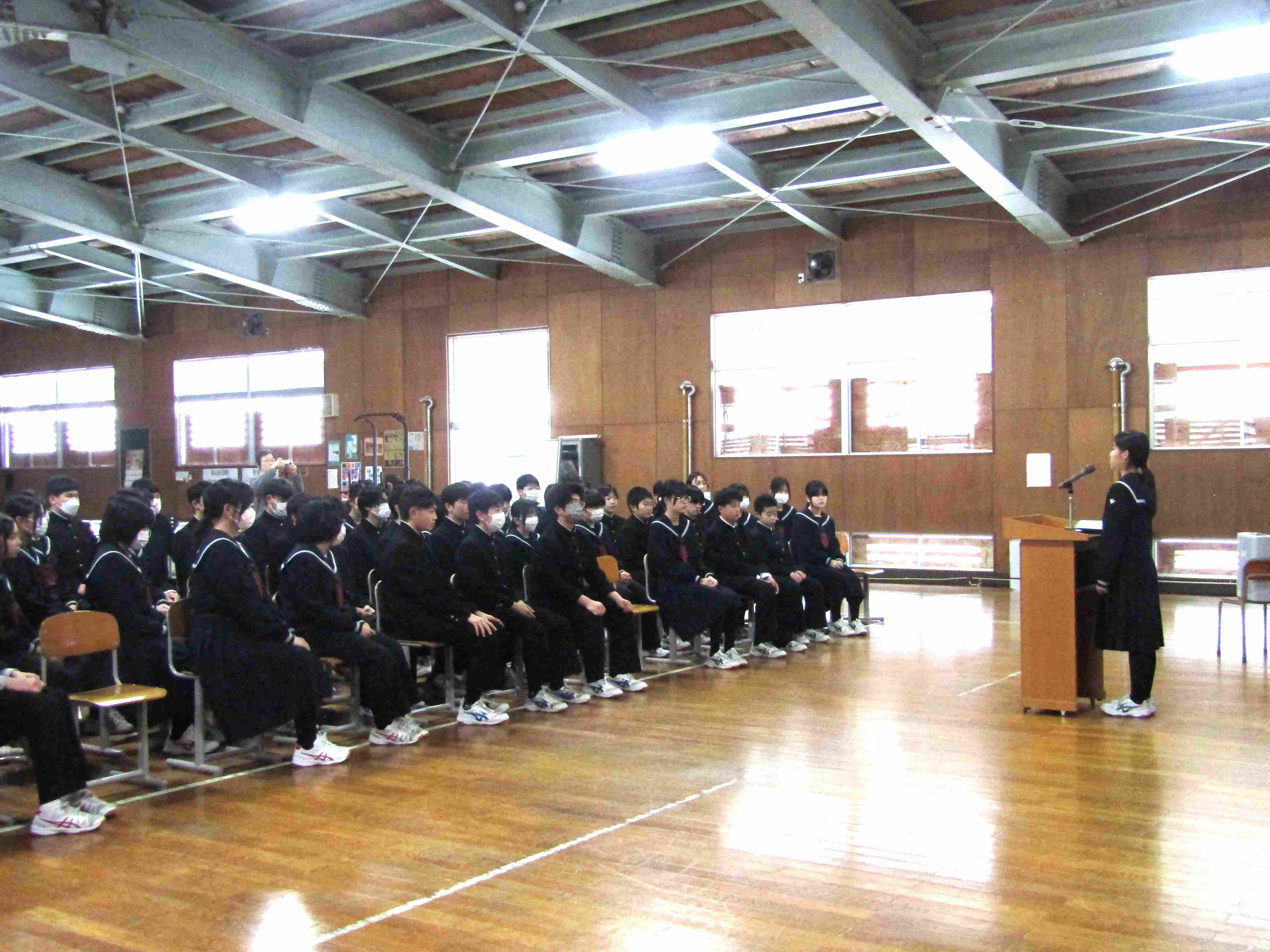 いよいよ明日から待望の冬休み。各学年代表生徒の発表の中に、「何事も意識するかしないかで成果が大きく変わることを実感できた2学期でした。」という言葉がありました。有意義な2学期を過ごし、生涯にわたって大切となる貴重な学びを得ることができたのだということが分かりました。校長先生からは、冬休み中の「再生」と「休息」、「粘り強さの発揮」というお話がありました。3学期、またみんなの笑顔が見られることを楽しみにしています。