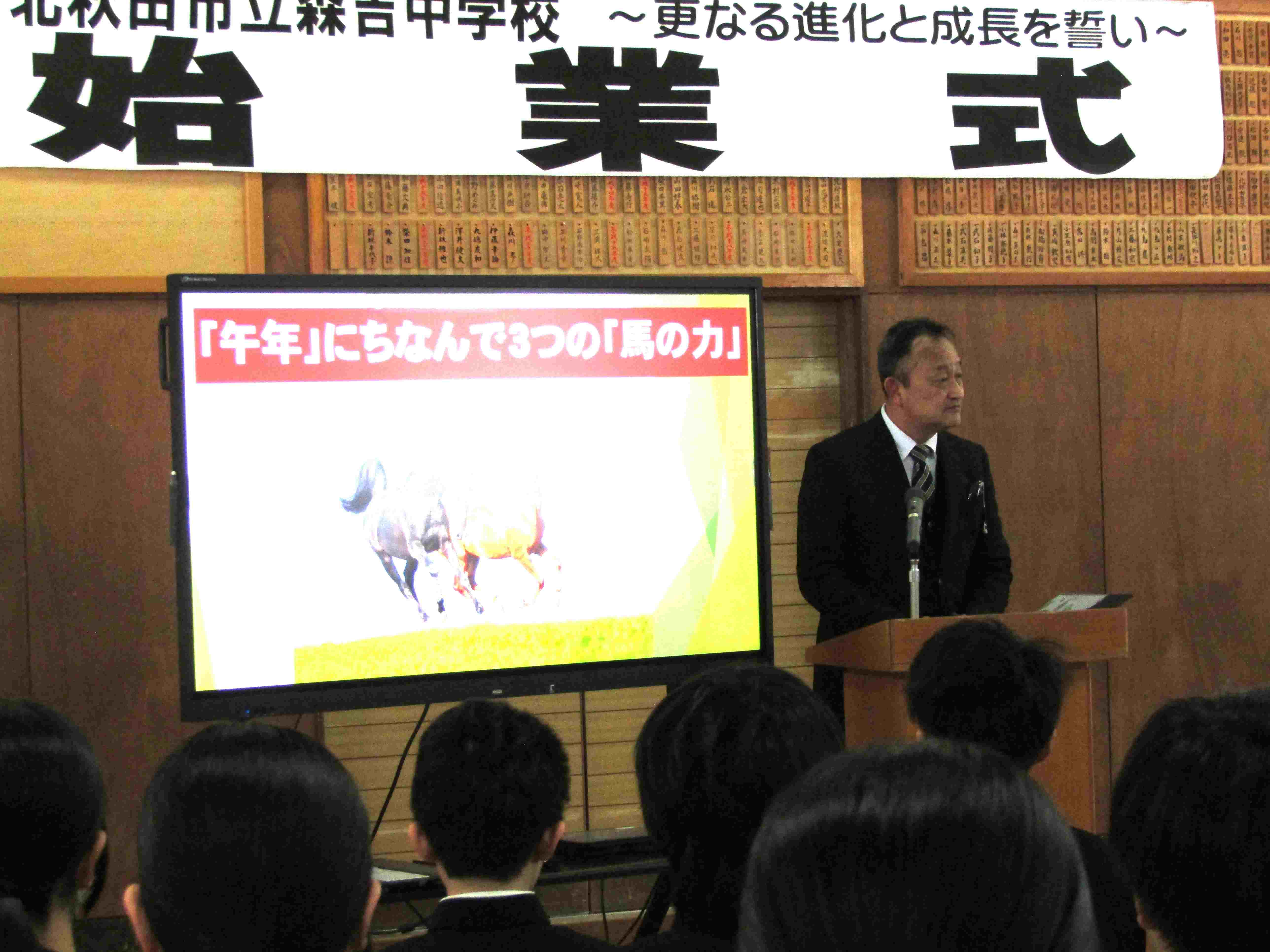 各学年代表の発表では、進級を見据えて3学期頑張りたいことが話されました。校長先生からは、午年にちなんで3つの「馬の力」についてのお話がありました。今年は、馬の勢いにも負けない、森中「躍進」の年にしたいと思います。
