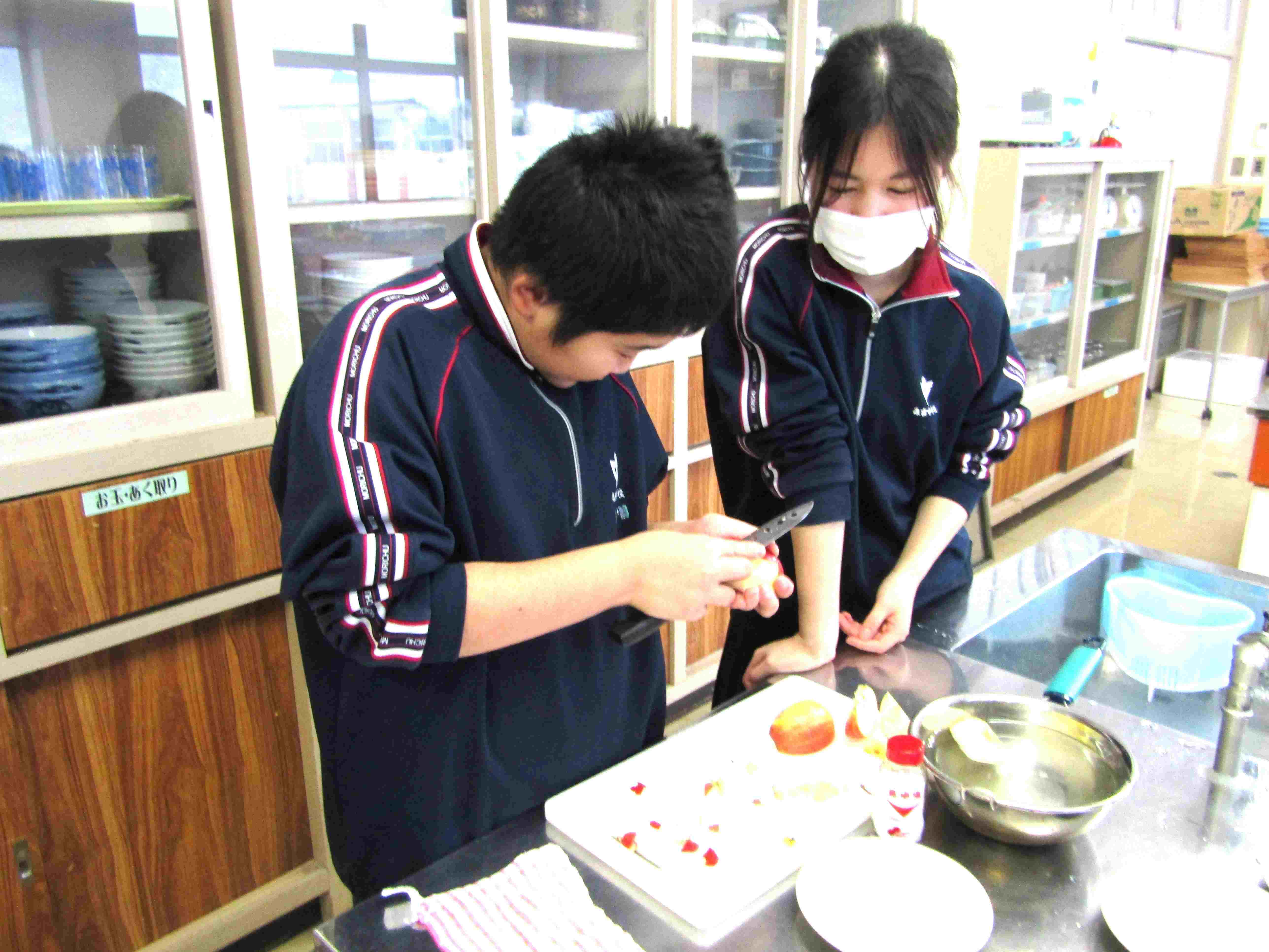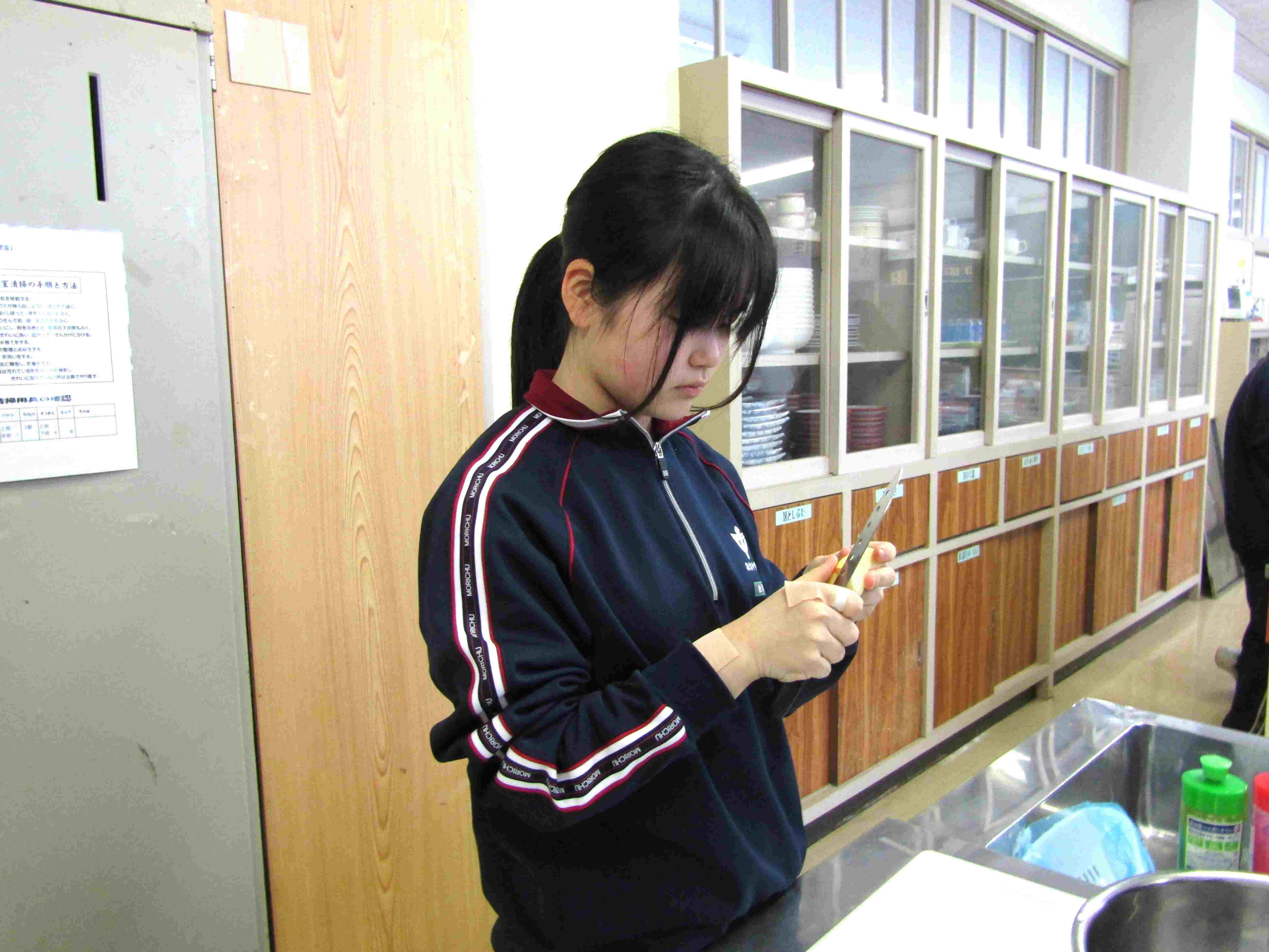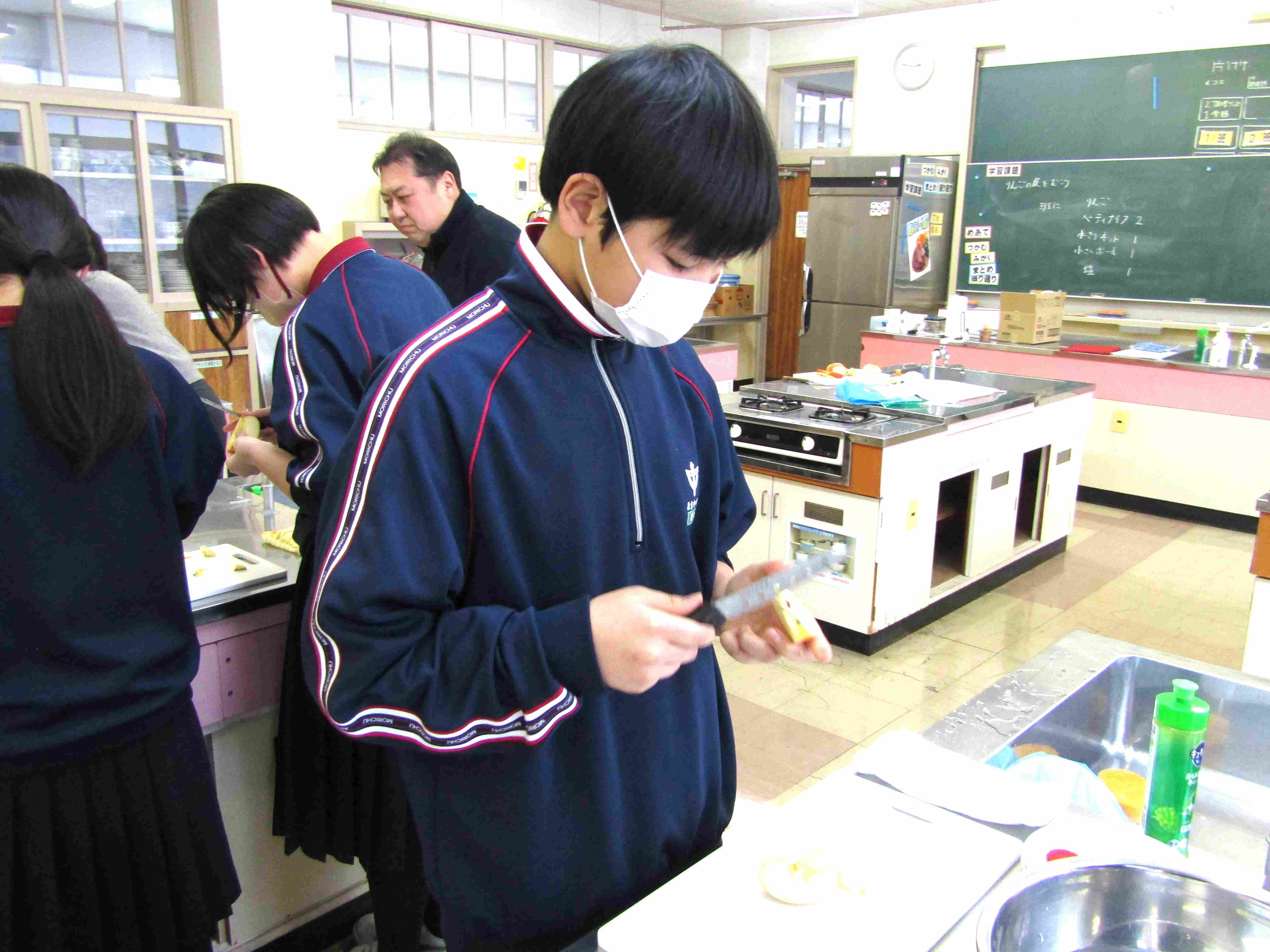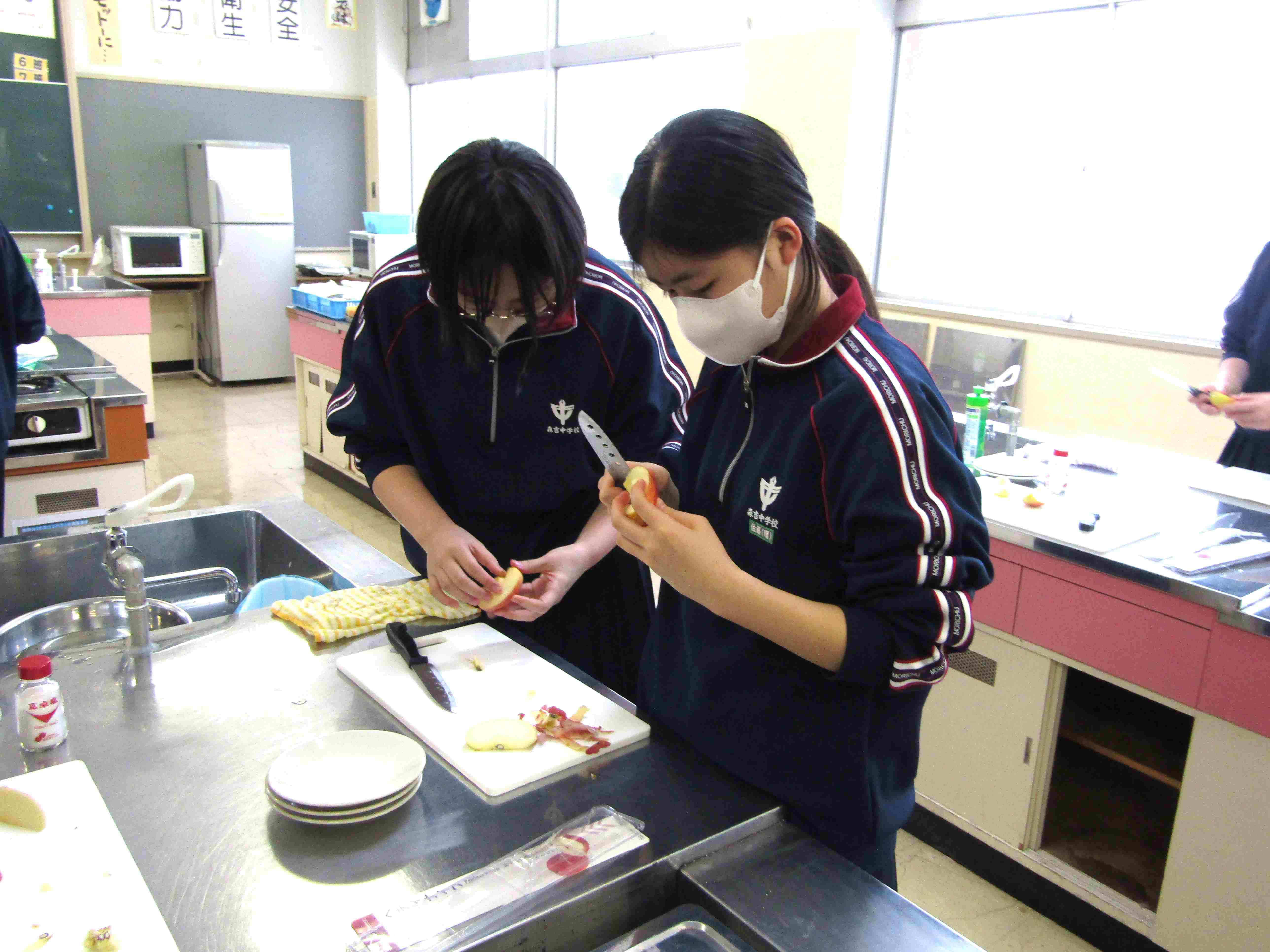 1年生がりんごを使って包丁の使い方の学習をしました。感心するほど巧みな包丁さばきの人、見ていてどきどきするような斬新な包丁の使い方をしている人とさまざまでした。なぜかりんごの皮が粉々になっている人もいました。