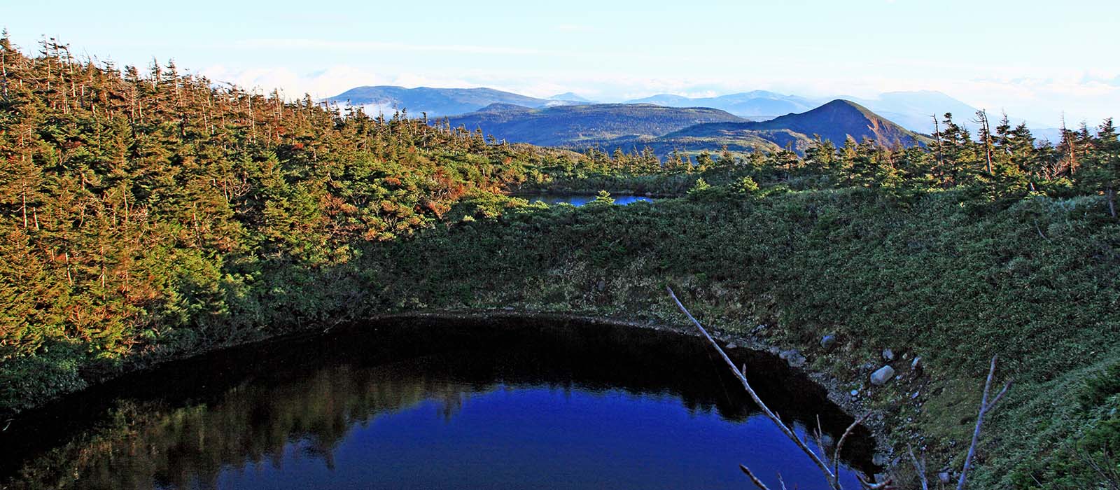 | 八幡平 (1613.6m) 八幡平地域は、第4期に噴出した約40もの火山により形成されている。代表的な山岳としては、この公園の最高峰岩手山(2038m)、秋田駒ヶ岳(1637m)、八幡平(1613m)、茶臼岳(1578m)、もっこ岳(1578m)、大深岳(1541m)、焼山(1366m)などがあり、八幡沼、ガマ沼、御苗代湖、御釜湖などの火口湖も多く存在している。 また、後所掛温泉や玉川温泉などでは噴気、噴泥などの現象が、今なお活発であり「火山の博物館」とも呼ばれている。後所掛、玉川、蒸ノ湯、藤七、松川、滝ノ上、網張、乳頭温泉郷などの、湯量が豊富で、泉質の異なる情緒豊かな温泉が点在し、今も昔ながらの長期滞在の湯治客が訪れる。これらの温泉の多くは、八幡平、岩手山、駒ヶ岳などへの登山基地として利用されているほか、冬季のスキー利用の拠点ともなっている。 |
