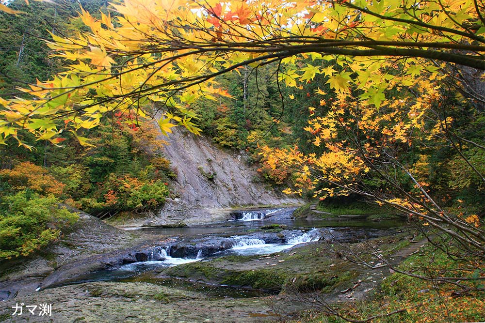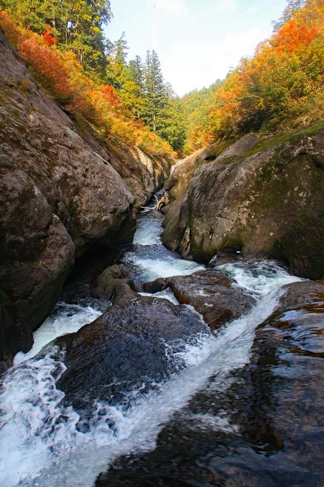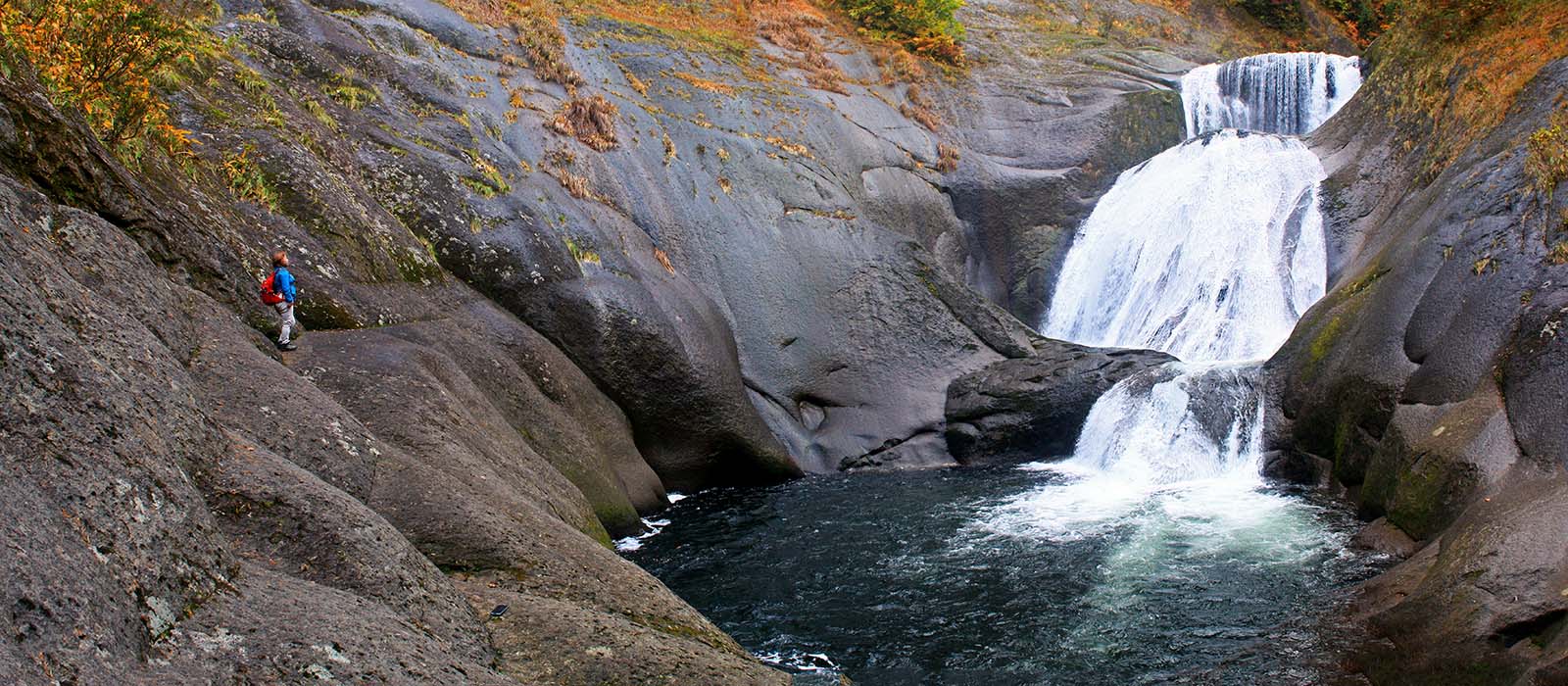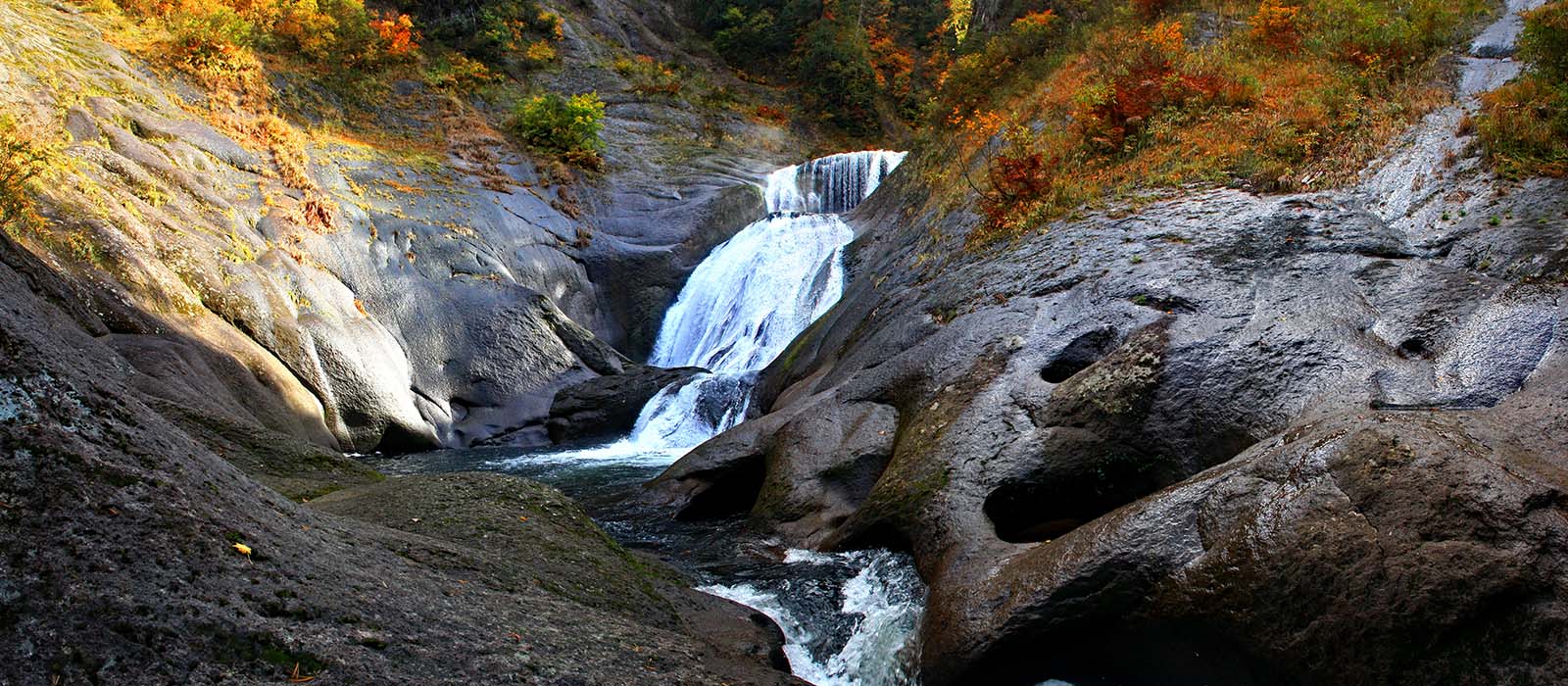 三階滝までは約2キロ、遊歩道に沿って 横滝、曲滝、千畳敷、ガマ淵、三角滝、穴滝、化ノ滝、化ノ堰、 化ノ穴滝などの小滝や深淵におう穴群が連続する深山幽谷の世界だ。 200万年前に噴出した火砕流が固まった容結凝灰岩の台地が浸食されてた渓谷は 尾根筋にキタゴヨウマツやネズコの針葉樹が群生する水墨画の絵巻だ。 新緑から錦秋の季節を愛でる散策者で賑わっている。 |