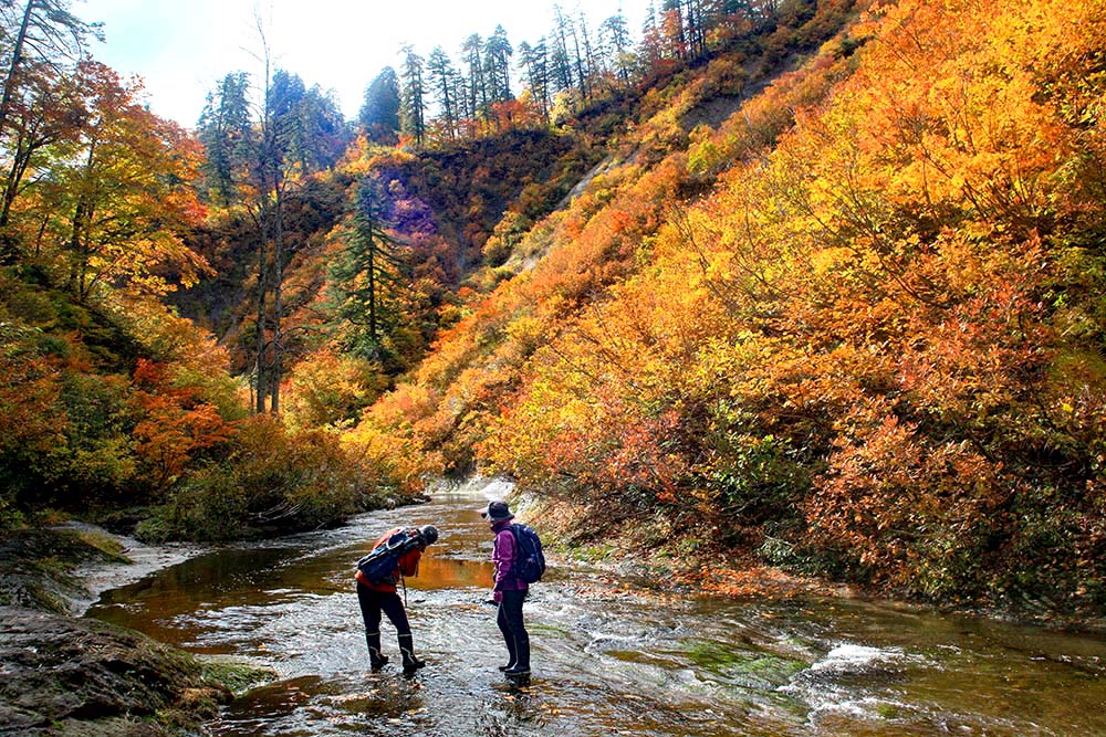 本流の右ノ沢を詰めると裏安滝歩道(奥森吉・奥阿仁縦走路)の出会いまで約1.2キロの遡行が楽しめる。
