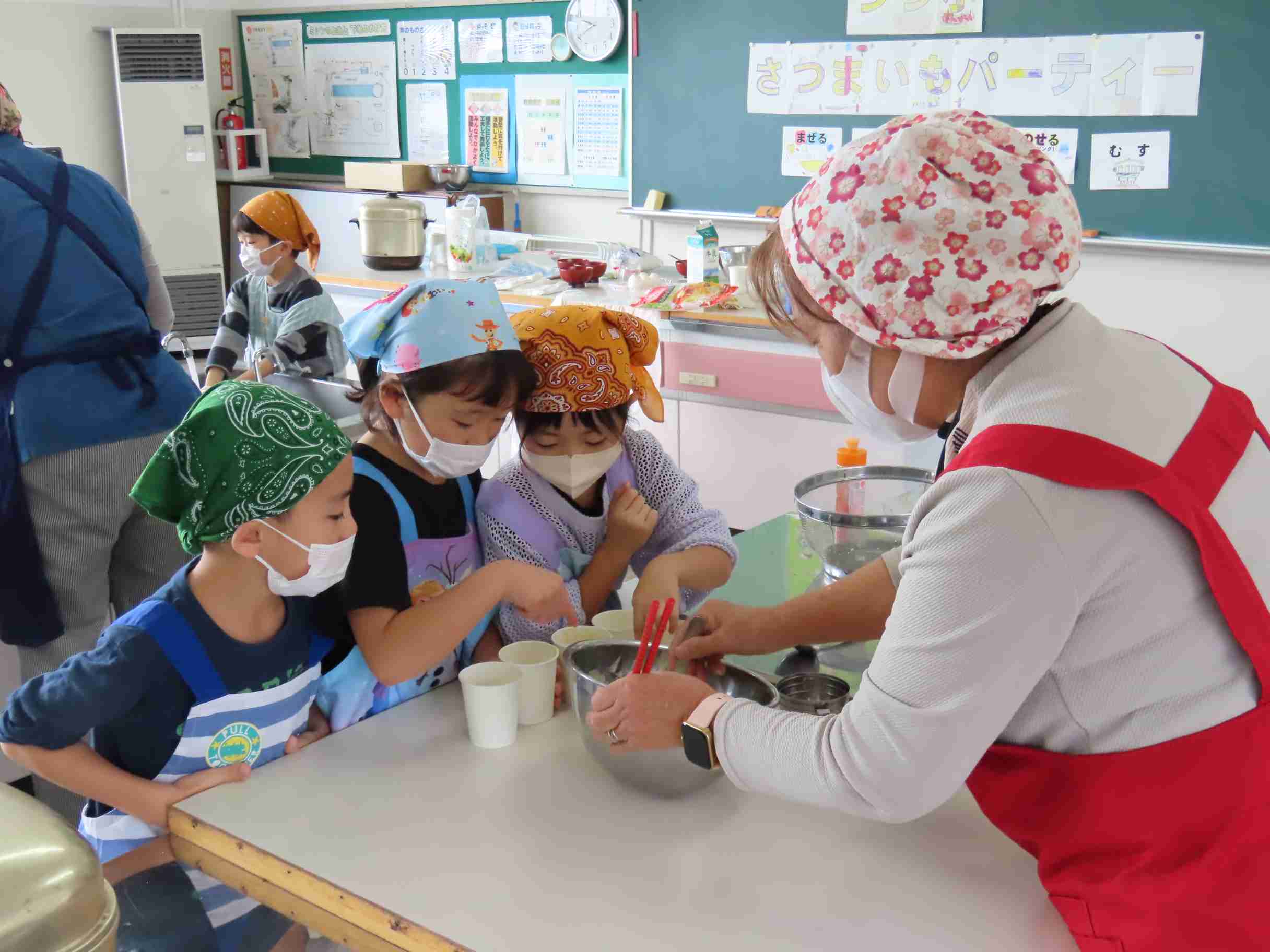 10月16日に掘ったさつまいもをつかって、蒸しケーキをつくりました。地域の方々がお手伝いにきてくださり、安全に楽しく調理ができました。