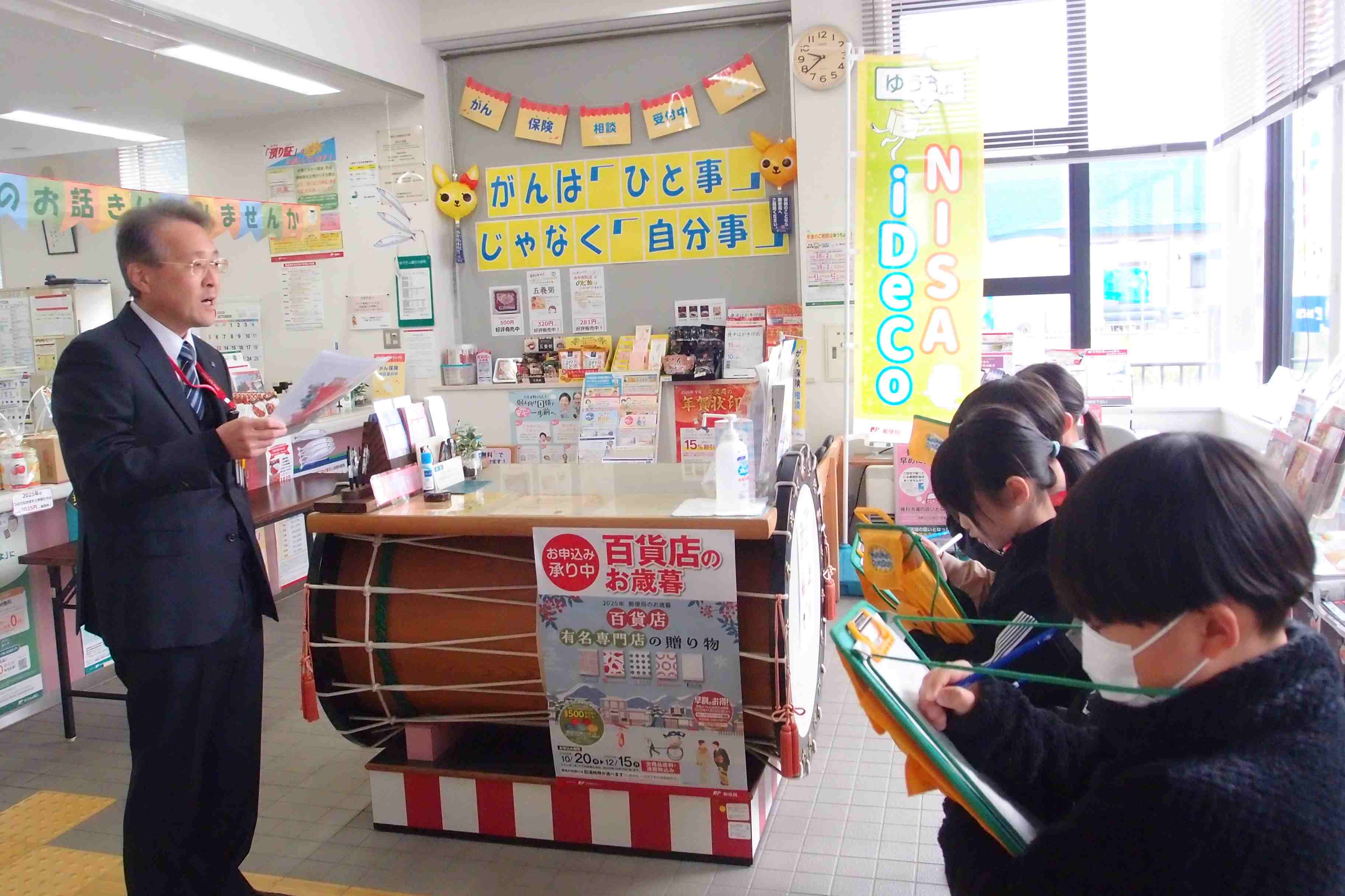 綴子郵便局とJA産直大太鼓を訪問しました。見学したり、疑問に思っていたことを質問したりして、学校の近くにある施設について詳しく知ることができました。