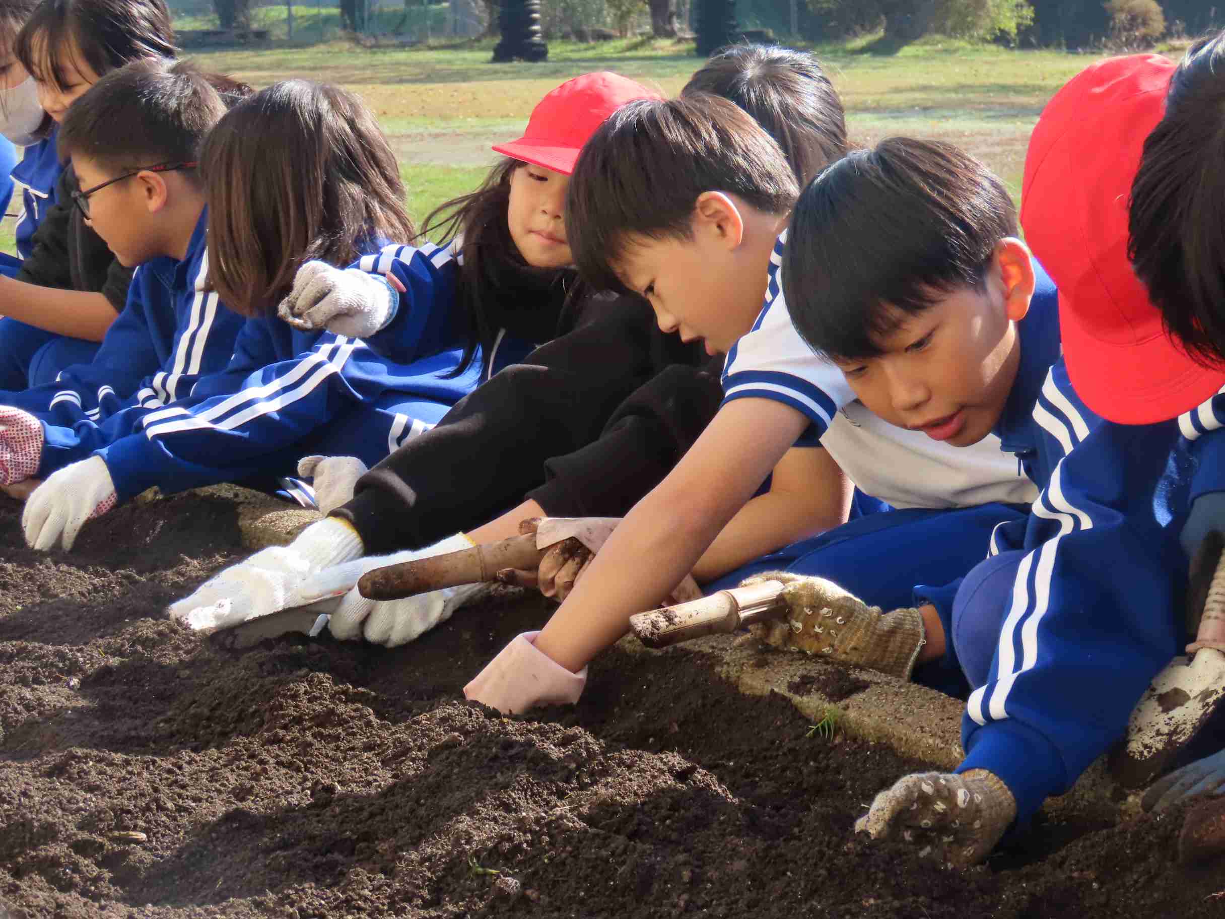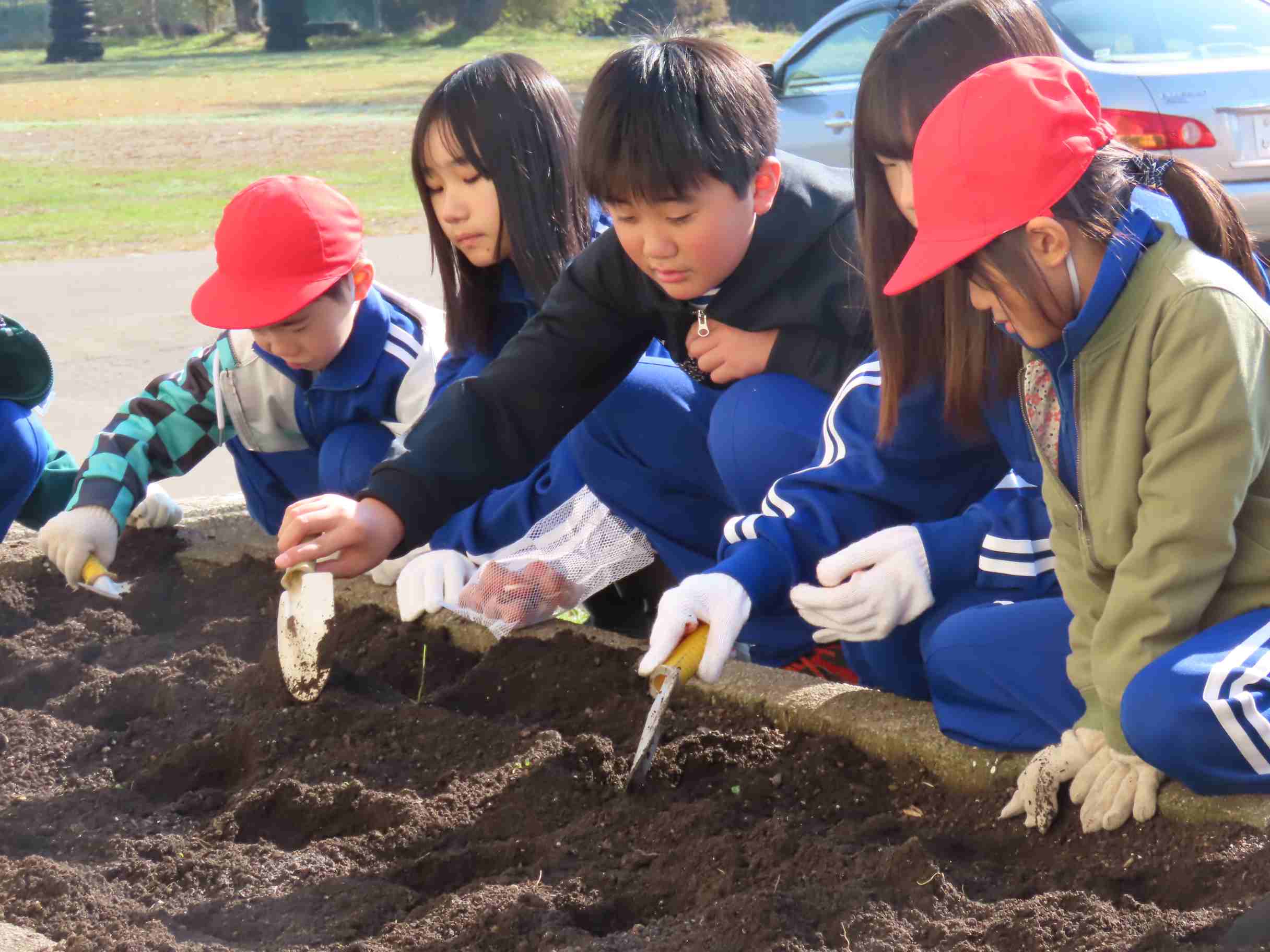 5、6年生が事前に土づくりをした花壇に、チューリップの球根を植えました。どんな花を咲かせてくれるか楽しみです。